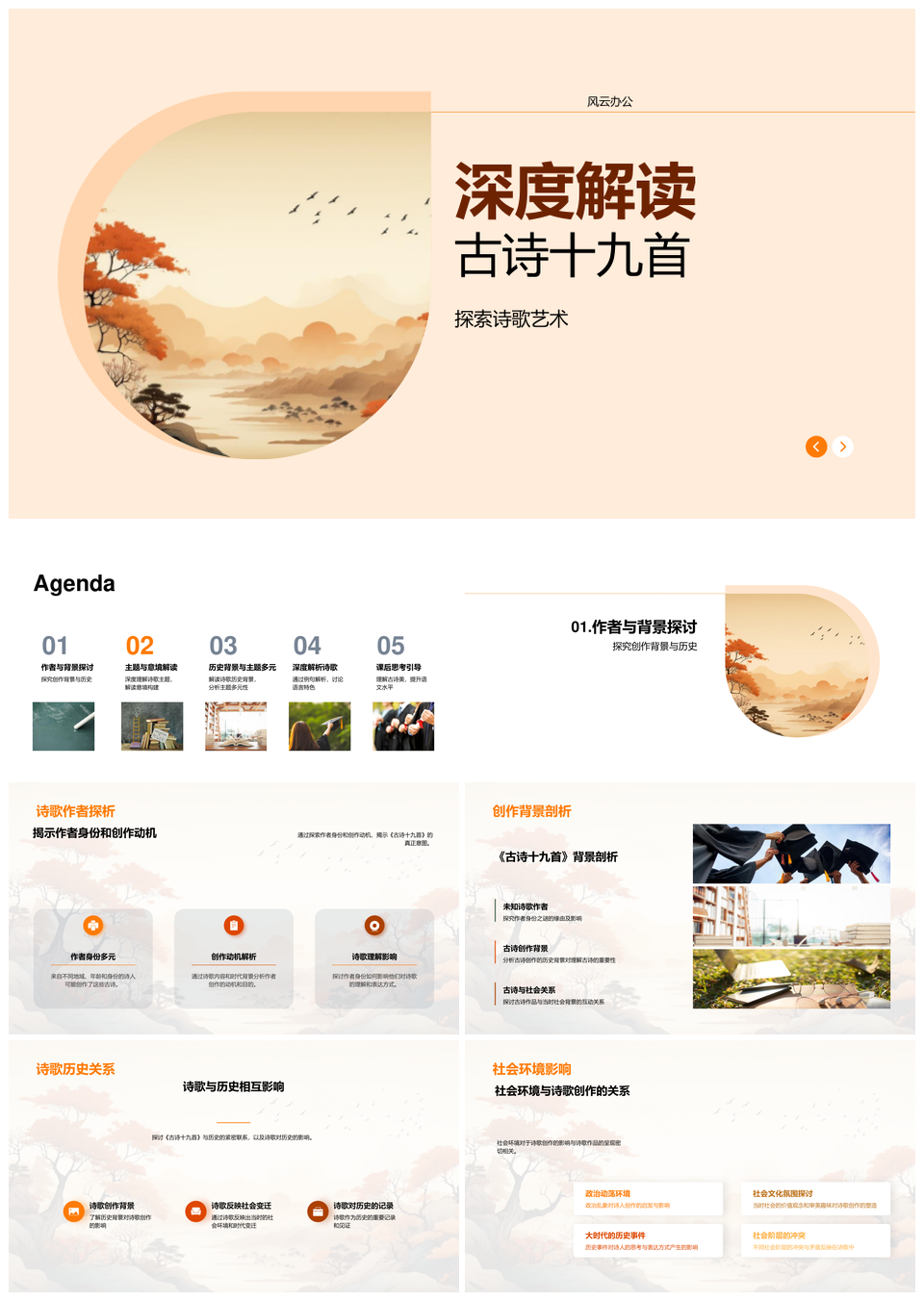 风云办公提供的古诗十九首艺术探源时代社会背景PPT模板,下载格式为pptx,一共25页,作品中文字及图均可以修改和编辑,图片更改请在作品中右键图片并更换,文字修改请直接点击文字进行修改。