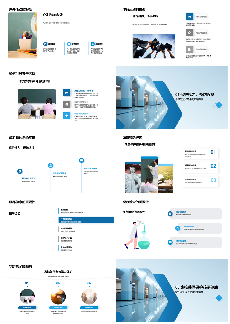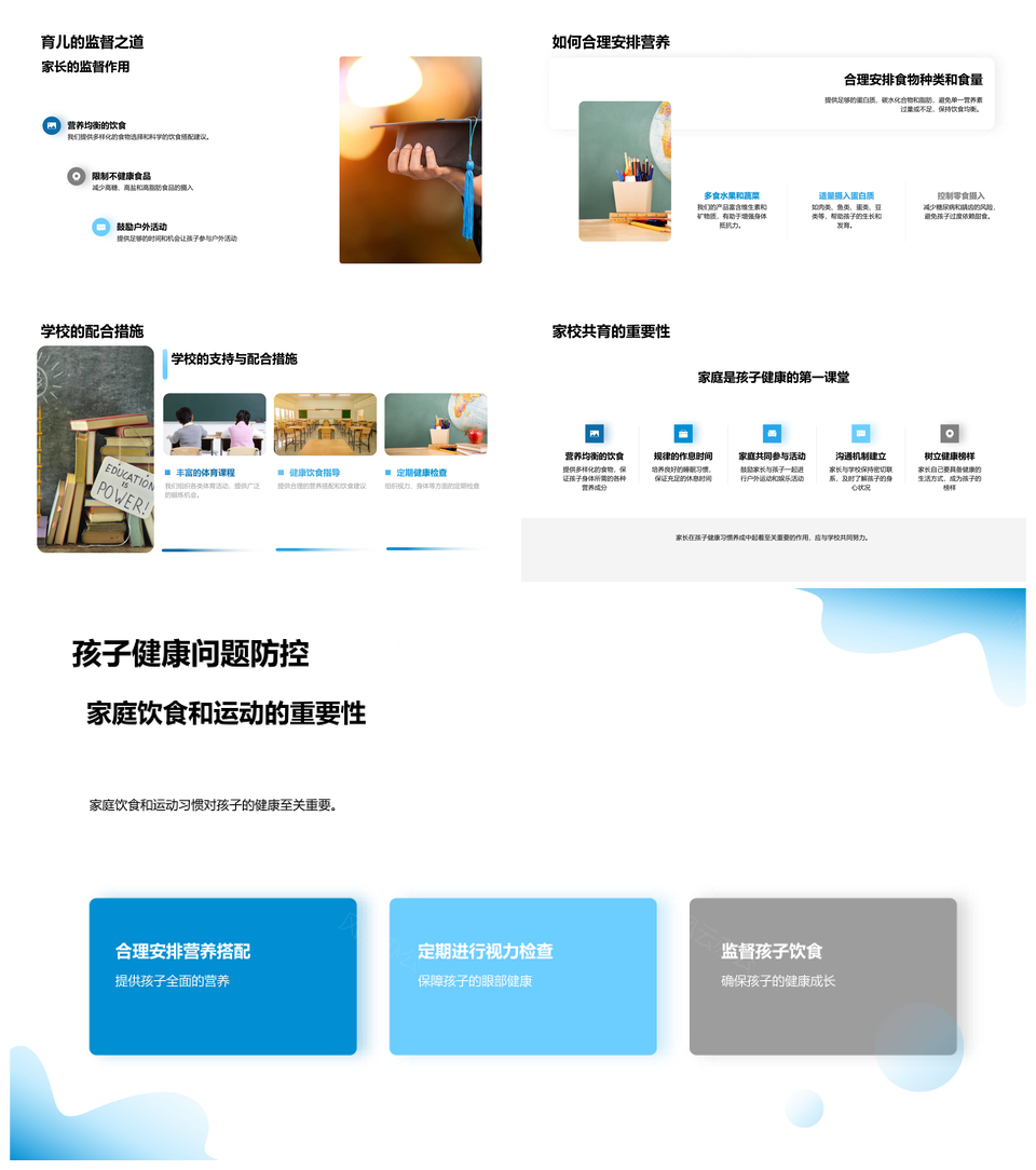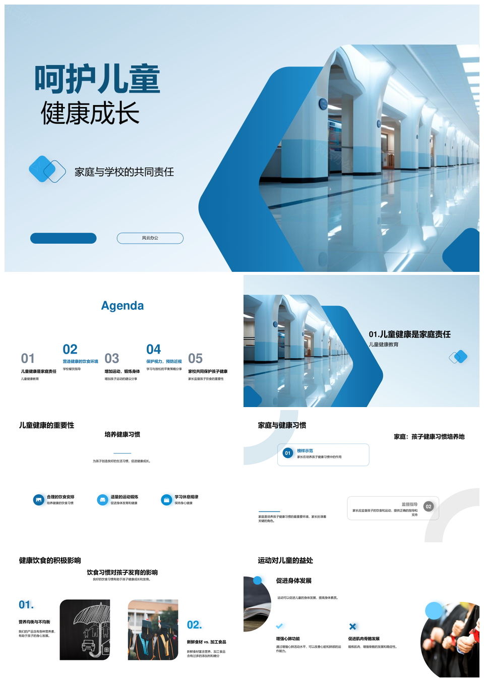 风云办公提供的家校共护儿童健康饮食运动习惯PPT模板,下载格式为pptx,一共33页,作品中文字及图均可以修改和编辑,图片更改请在作品中右键图片并更换,文字修改请直接点击文字进行修改。