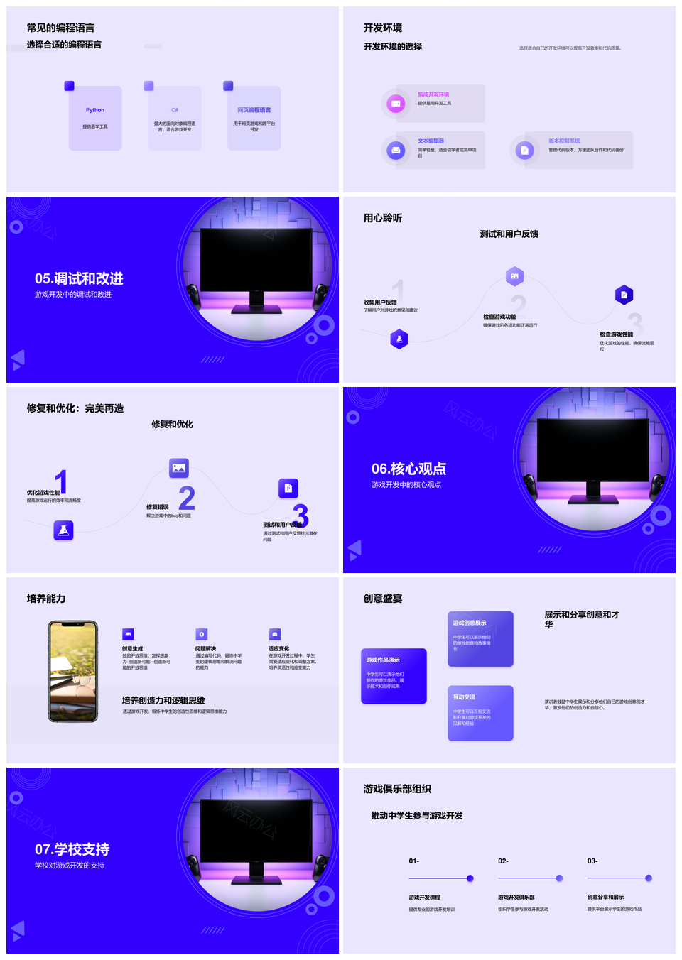 这是一张中学生游戏开发导师指导兴趣基础逻辑设计PPT模板,包含中学生、游戏开发、导师、指导、兴趣、基础、逻辑、设计等主题内容,也可用作中学生游戏开发导师指导、游戏开发导师指导兴趣、导师指导兴趣基础逻辑设计、中学生游戏开发兴趣基础、游戏开发兴趣基础逻辑设计、中学生导师指导逻辑设计、兴趣基础逻辑设计指导、游戏开发导师兴趣基础、中学生指导兴趣基础、导师兴趣基础逻辑设计、中学生游戏开发基础、游戏开发导师逻辑设计、兴趣基础逻辑设计、导师指导基础逻辑、游戏开发兴趣基础等PPT场景使用。 风云办公提供的中学生游戏开发导师指导兴趣基础逻辑设计PPT模板,下载格式为pptx,一共30页,作品中文字及图均可以修改和编辑,图片更改请在作品中右键图片并更换,文字修改请直接点击文字进行修改。