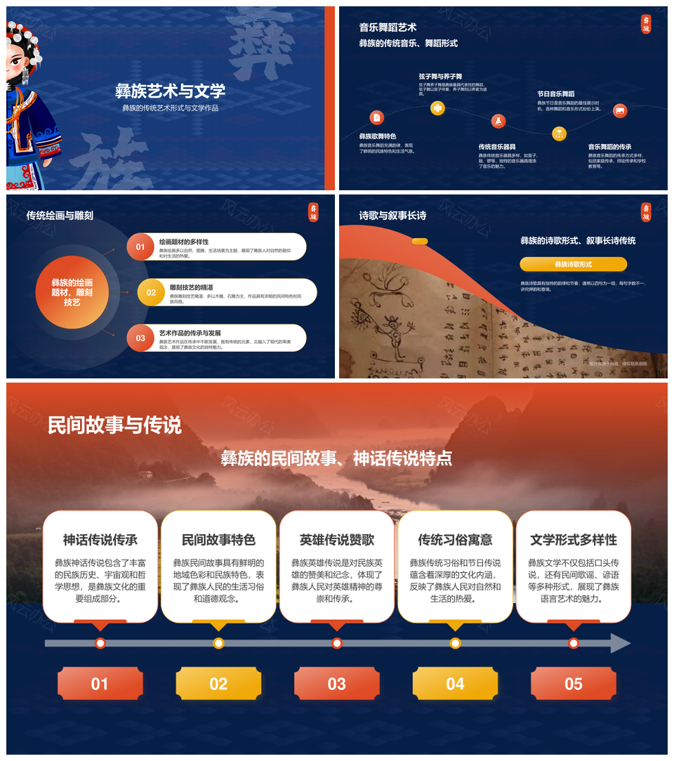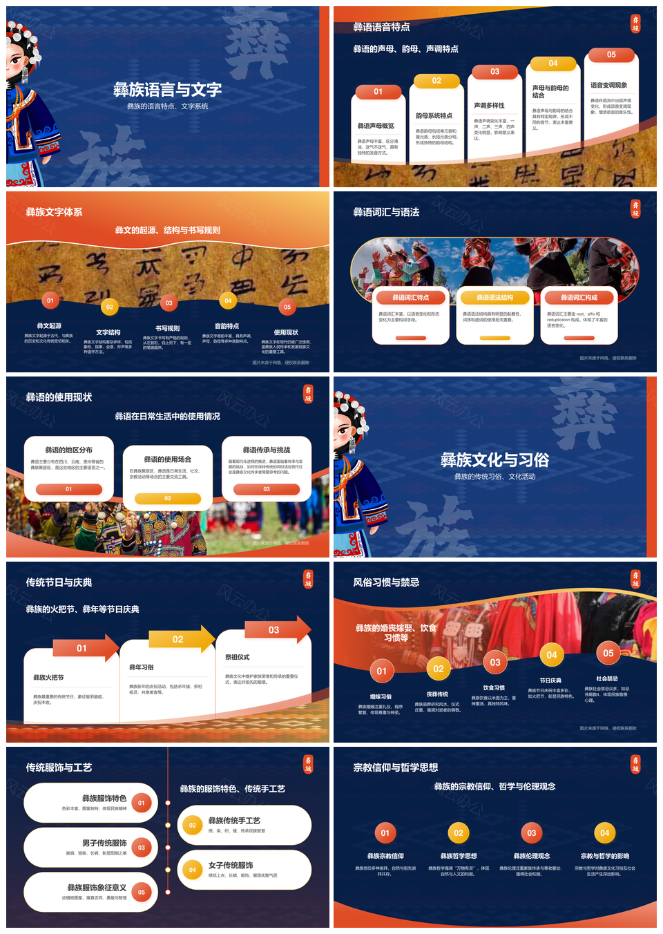 这是一张彝族历史文化传统语言概况渊源分布特色人口团结PPT模板,包含彝族、历史文化、传统、语言、概况、渊源、分布、特色、人口、团结等主题内容,也可用作彝族历史文化传统语言、历史文化传统语言概况、传统语言概况渊源、语言概况渊源分布、概况渊源分布特色、渊源分布特色人口、分布特色人口团结、彝族历史文化传统、历史文化传统语言、传统语言概况、语言概况渊源、概况渊源分布、彝族历史文化、历史文化传统、传统语言等PPT场景使用。 风云办公提供的彝族历史文化传统语言概况渊源分布特色人口团结PPT模板,下载格式为pptx,一共23页,作品中文字及图均可以修改和编辑,图片更改请在作品中右键图片并更换,文字修改请直接点击文字进行修改。