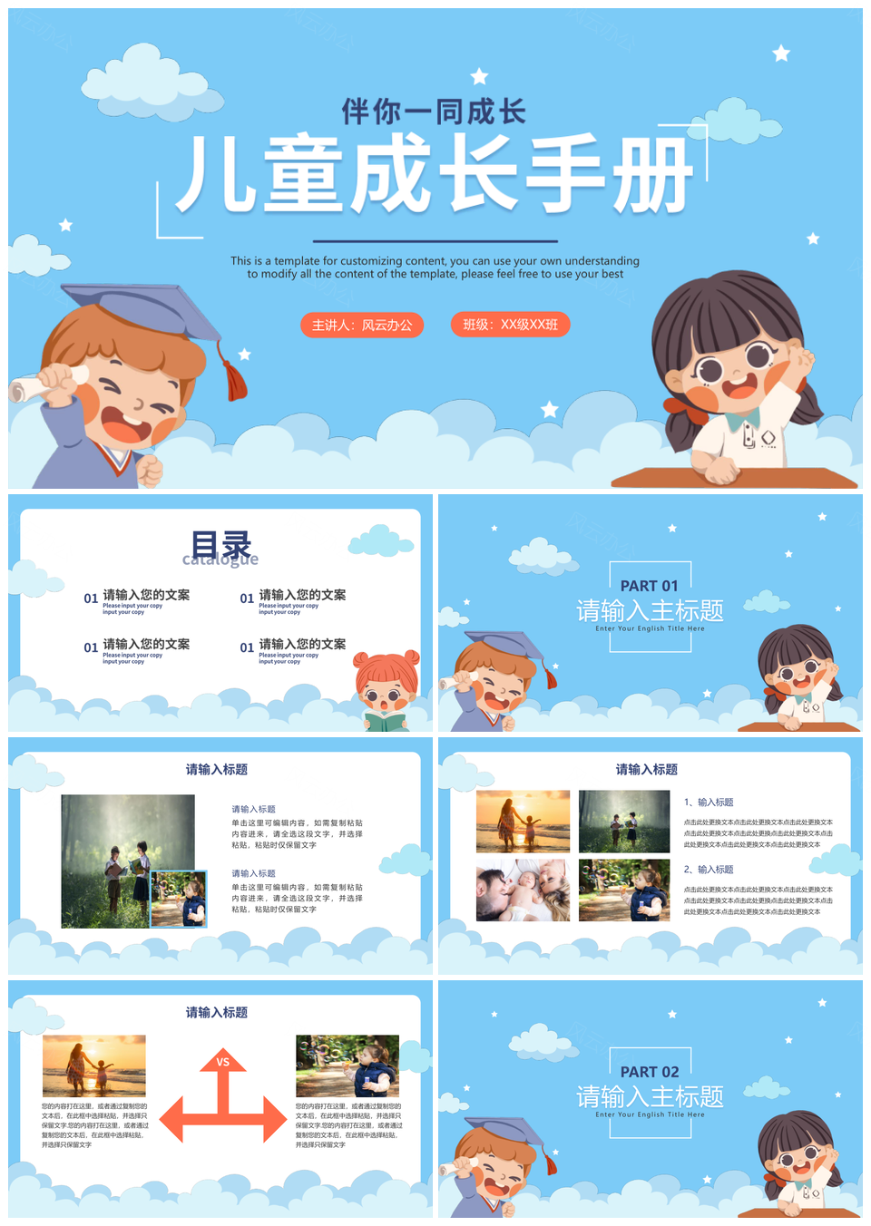 风云办公提供的蓝色卡通可爱儿童成长手册扁平插画PPT模板,下载格式为pptx,一共19页,作品中文字及图均可以修改和编辑,图片更改请在作品中右键图片并更换,文字修改请直接点击文字进行修改。