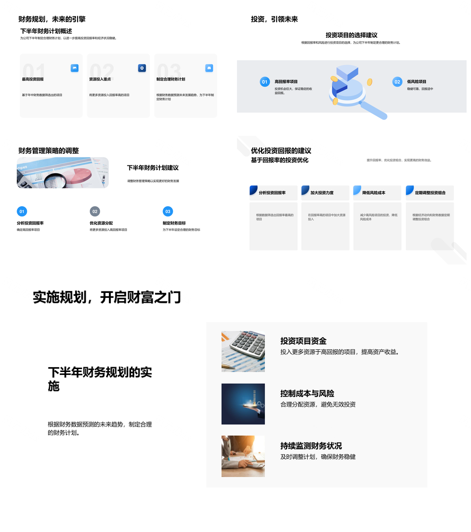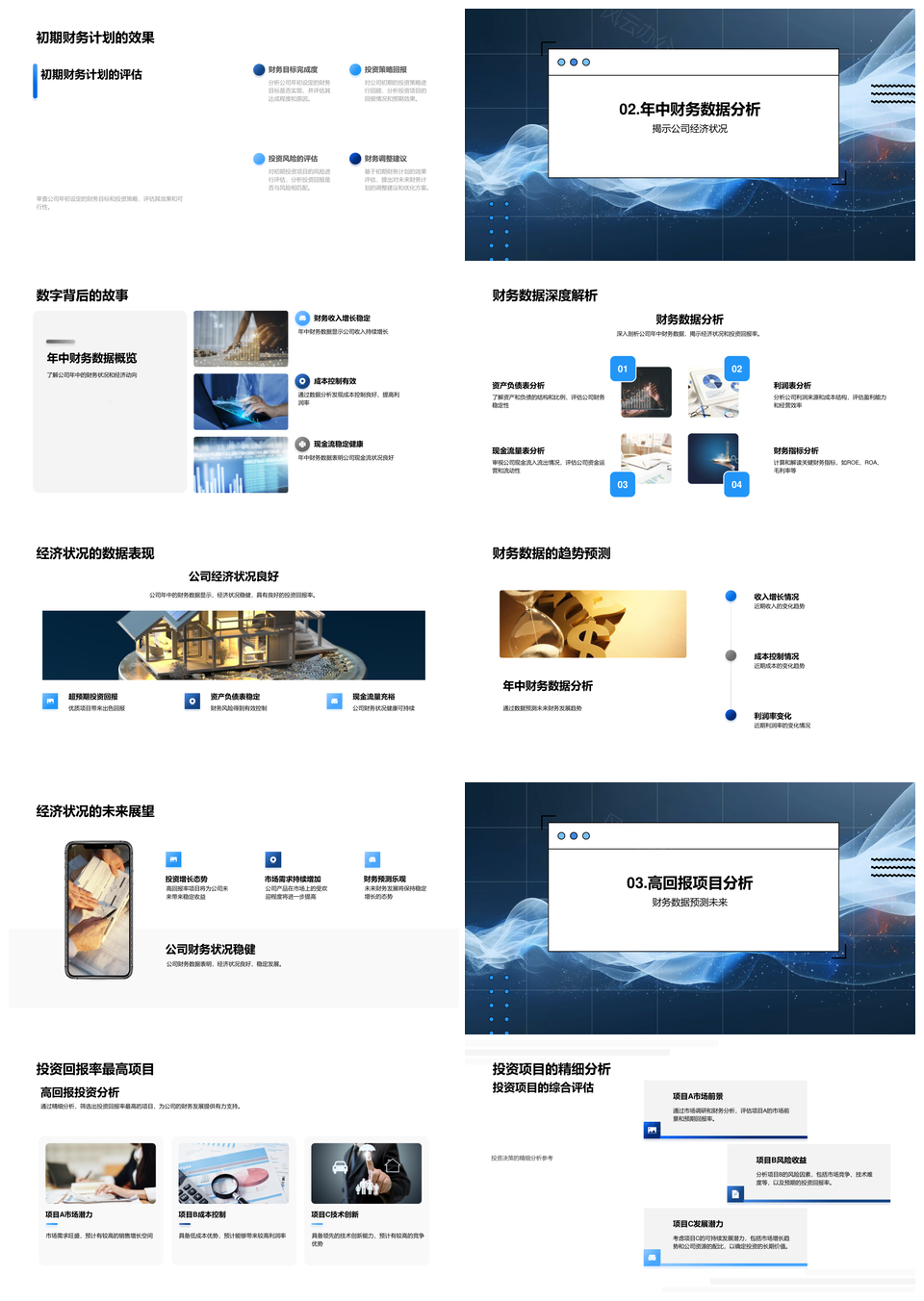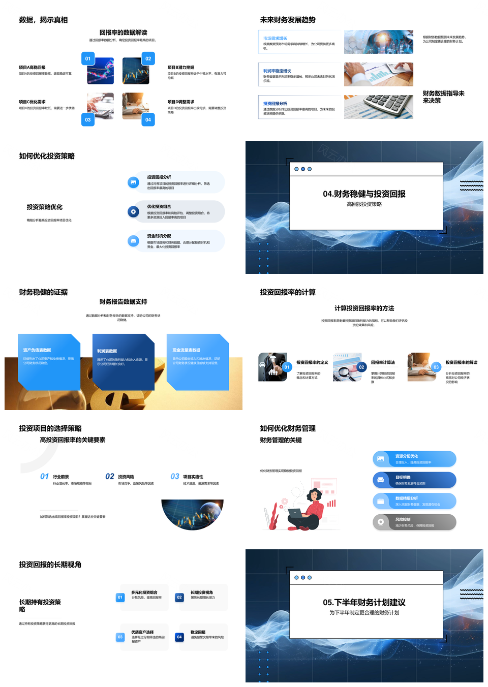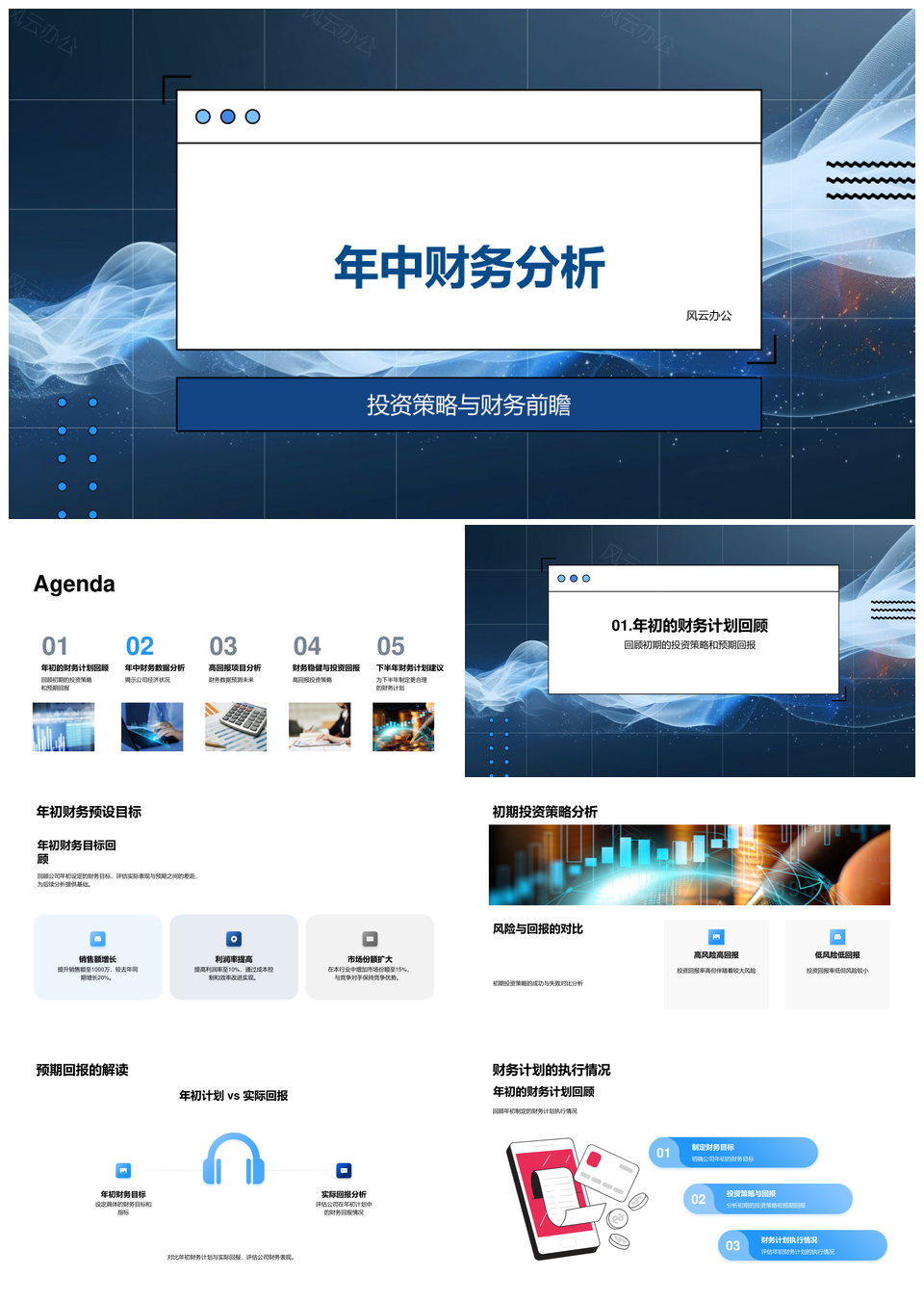 风云办公提供的年中财务分析投资策略高回报前瞻PPT模板,下载格式为pptx,一共33页,作品中文字及图均可以修改和编辑,图片更改请在作品中右键图片并更换,文字修改请直接点击文字进行修改。