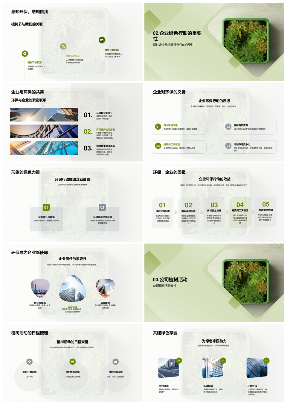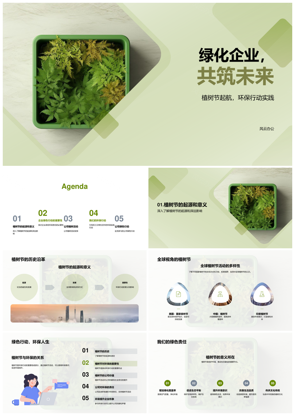 这是一张绿化企业植树节年会倡环保公益树苗行动PPT模板,包含绿化企业、植树节、年会、倡、环保公益、树苗、行动等主题内容,也可用作绿化企业植树节年会、环保公益树苗行动、企业植树节年会环保、植树节年会环保公益、环保公益树苗行动、绿化企业植树节、企业植树节年会、植树节年会环保、年会环保公益、环保公益树苗、公益树苗行动、绿化企业、企业植树节、植树节年会、环保公益等PPT场景使用。 风云办公提供的绿化企业植树节年会倡环保公益树苗行动PPT模板,下载格式为pptx,一共33页,作品中文字及图均可以修改和编辑,图片更改请在作品中右键图片并更换,文字修改请直接点击文字进行修改。