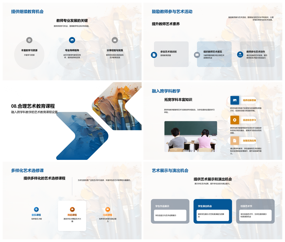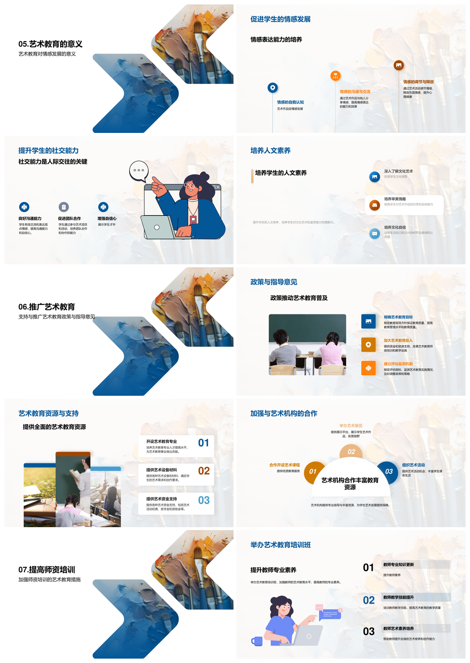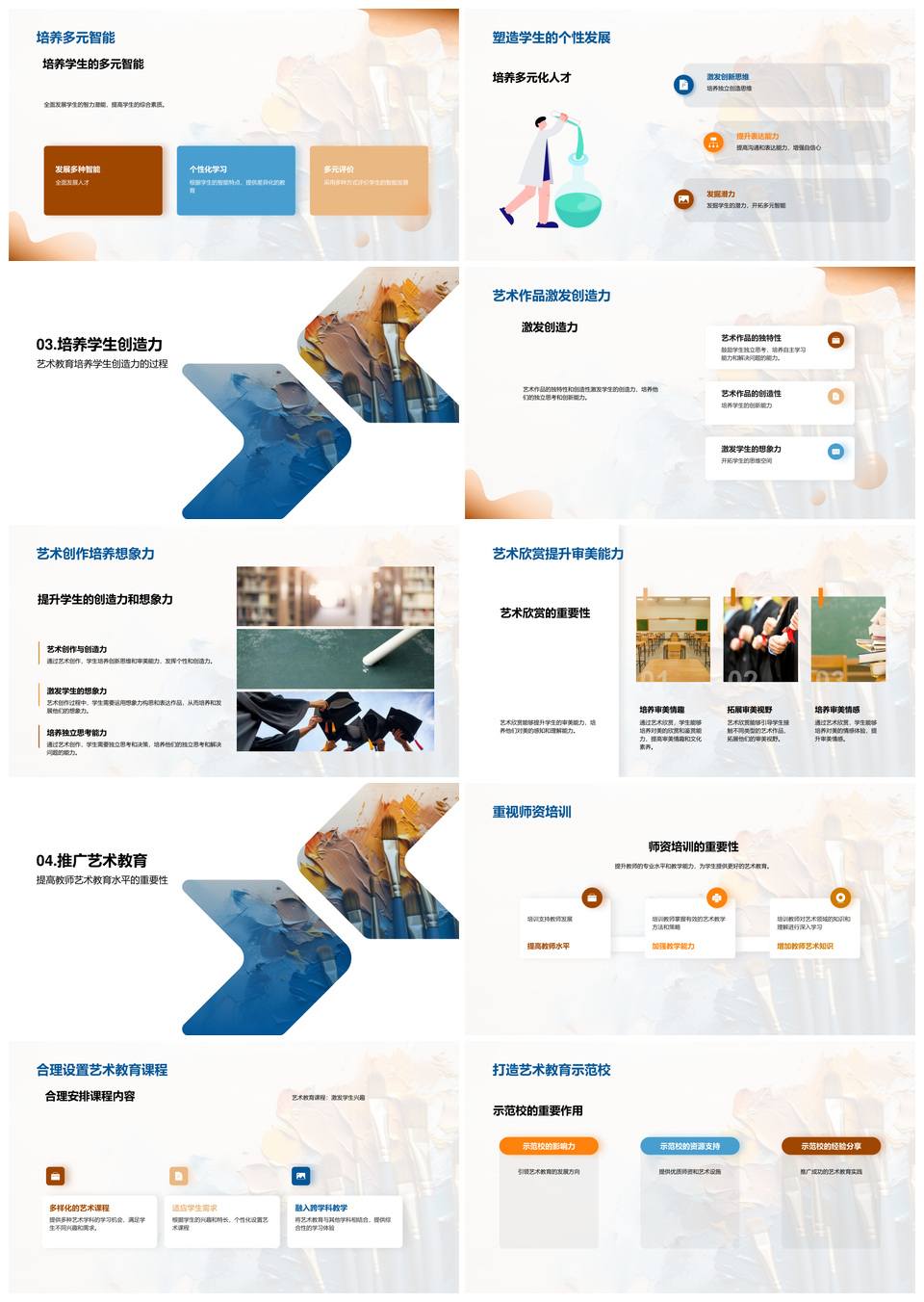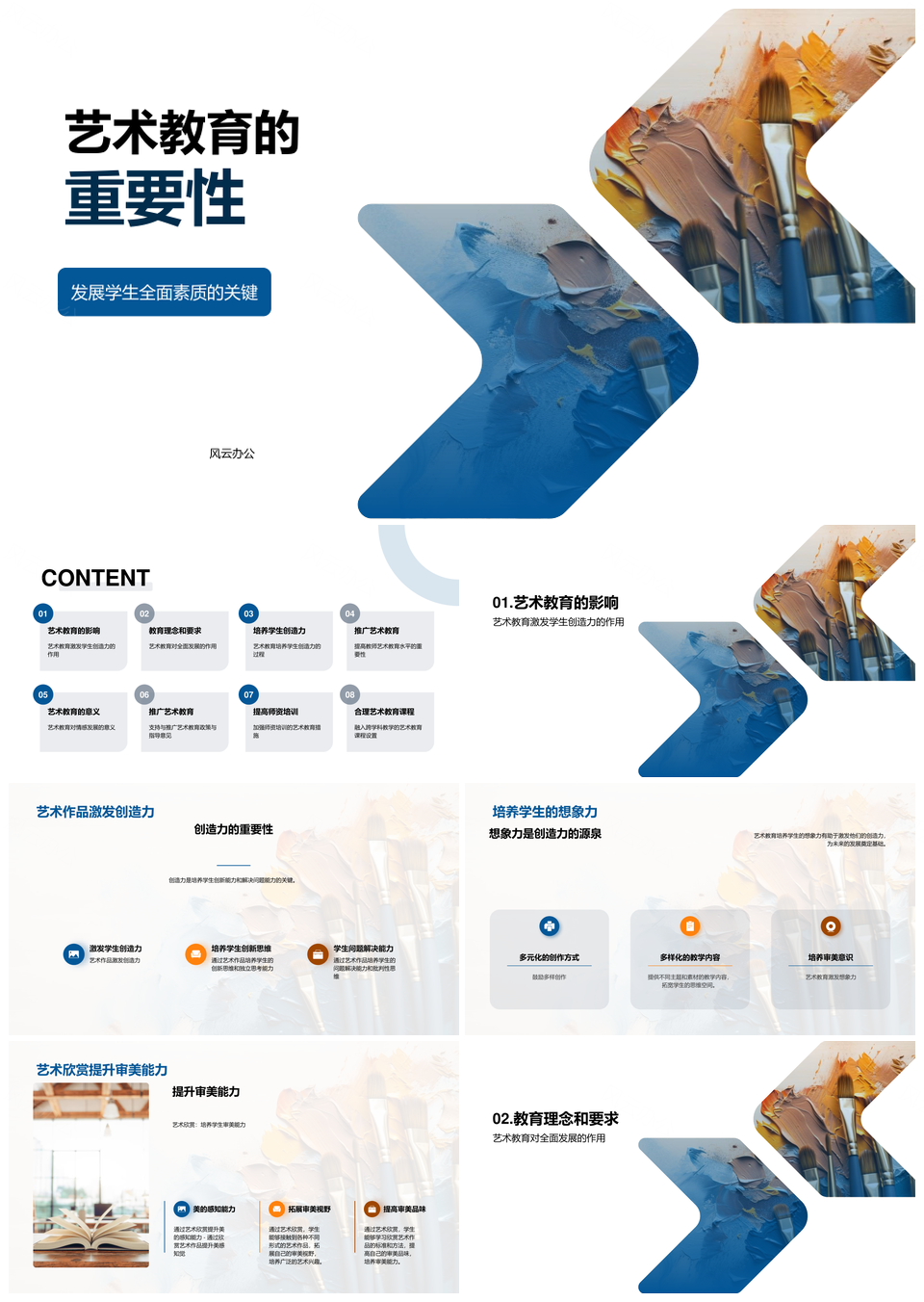 这是一张艺术教育育全人创造力想象力审美多元发展PPT模板,包含艺术教育、全人、创造力、想象力、审美、多元发展等主题内容,也可用作艺术教育全人创造力想象力、艺术教育创造力想象力审美、全人创造力想象力审美、创造力想象力审美多元发展、艺术教育全人创造力、艺术教育创造力想象力、全人创造力想象力、创造力想象力审美、艺术教育全人想象力、艺术教育全人多元发展、艺术教育审美多元发展、全人创造力多元发展、创造力想象力多元发展、全人想象力审美、想象力审美多元发展等PPT场景使用。 风云办公提供的艺术教育育全人创造力想象力审美多元发展PPT模板,下载格式为pptx,一共34页,作品中文字及图均可以修改和编辑,图片更改请在作品中右键图片并更换,文字修改请直接点击文字进行修改。