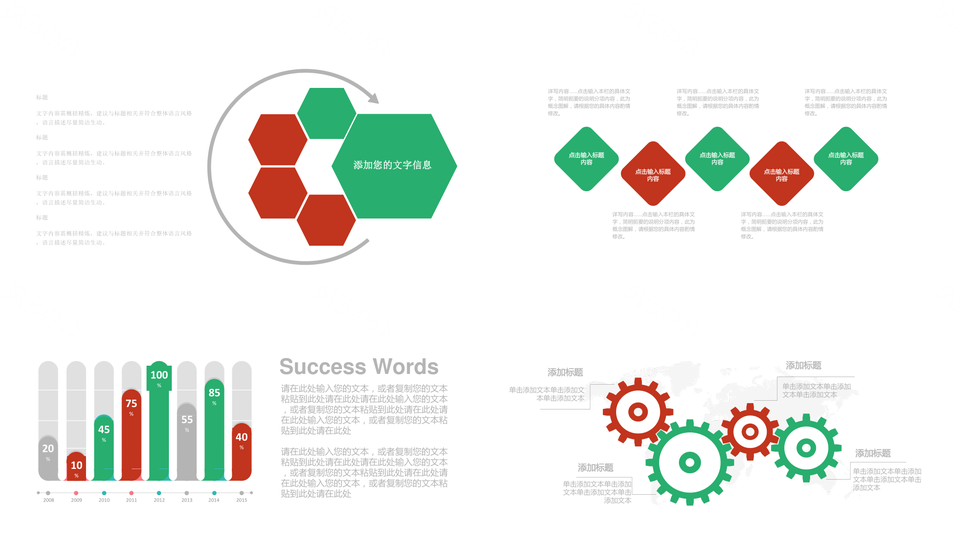 这是一张红绿配色扁平化PPT模板,包含红绿配色、扁平化等主题内容,也可用作红绿、配色、扁平化 红绿配色扁平化、扁平化红绿配色、红绿配色、配色扁平化、红绿扁平化、扁平化配色等PPT场景使用。 风云办公提供的红绿配色扁平化PPT模板,下载格式为pptx,一共31页,作品中文字及图均可以修改和编辑,图片更改请在作品中右键图片并更换,文字修改请直接点击文字进行修改。