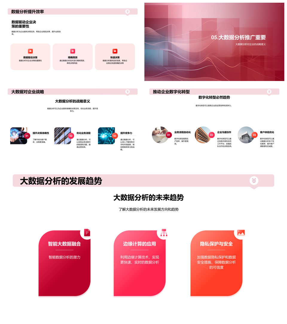 风云办公提供的大数据分析驱动商业价值与效益PPT模板,下载格式为pptx,一共23页,作品中文字及图均可以修改和编辑,图片更改请在作品中右键图片并更换,文字修改请直接点击文字进行修改。