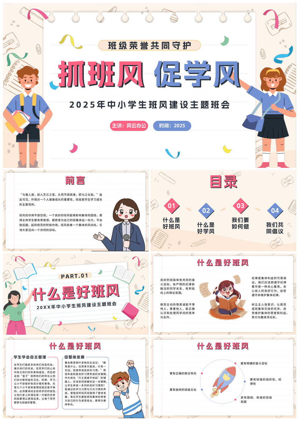 风云办公提供的2025班风学风建设主题教育班会课PPT模板,下载格式为pptx,一共19页,作品中文字及图均可以修改和编辑,图片更改请在作品中右键图片并更换,文字修改请直接点击文字进行修改。