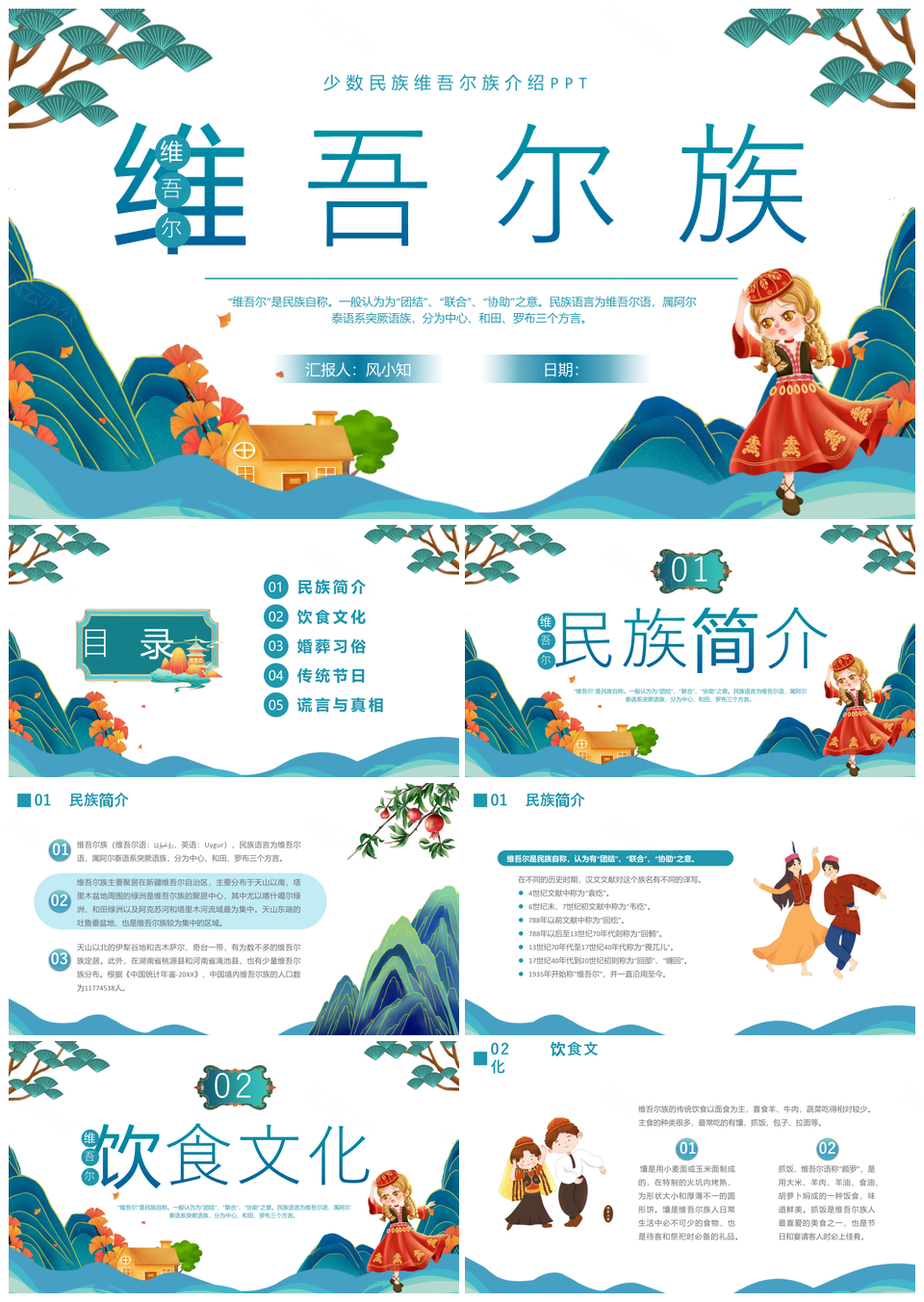 风云办公提供的蓝绿插画维吾尔族民族文化学生PPT模板,下载格式为pptx,一共24页,作品中文字及图均可以修改和编辑,图片更改请在作品中右键图片并更换,文字修改请直接点击文字进行修改。