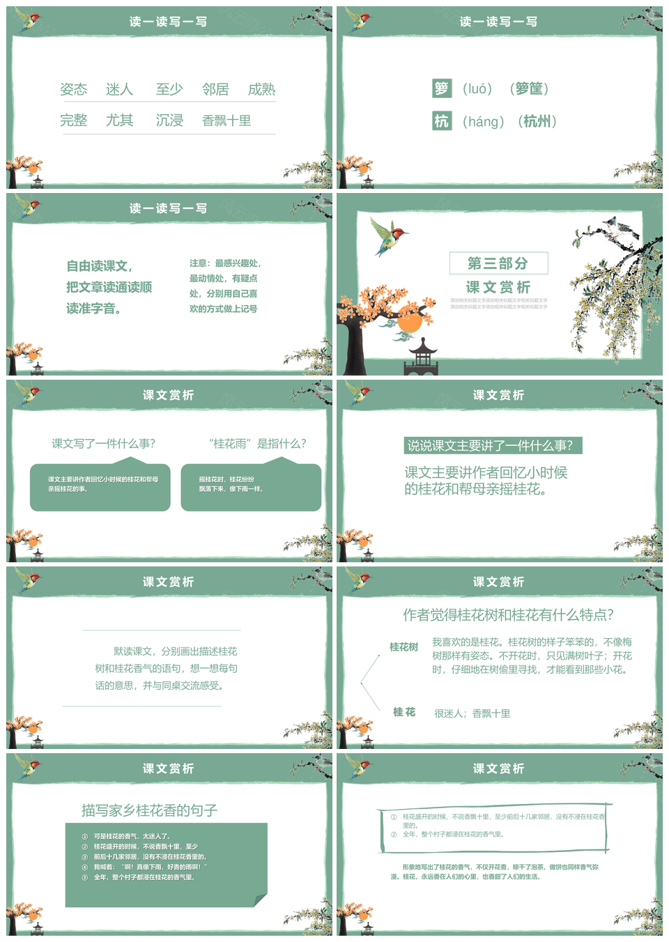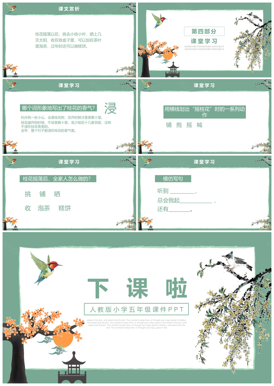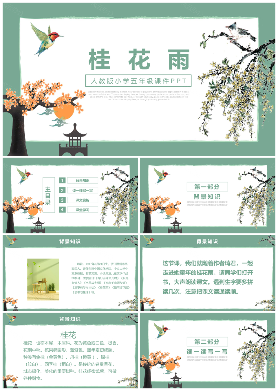 这是一张人教版小学五年级课件桂花雨PPT模板,包含人教版、小学、五年级、课件、桂花雨等主题内容,也可用作人教版、小学、五年级、课件、桂花雨