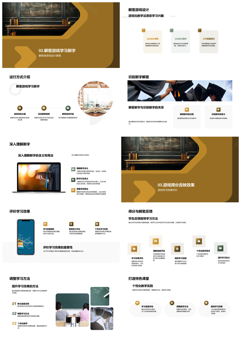 这是一张游戏化解密新字教学提升二年级思维记忆力PPT模板,包含游戏化、解密、新字教学、提升、二年级、思维记忆力等主题内容,也可用作游戏化解密新字教学、游戏化解密新字思维、解密新字教学提升、新字教学提升二年级、教学提升二年级思维、提升二年级思维记忆力、游戏化解密教学、游戏化解密新字、新字教学思维、解密新字教学、教学提升思维、二年级思维记忆力、游戏化解密、解密新字、新字教学、提升思维等PPT场景使用。 风云办公提供的游戏化解密新字教学提升二年级思维记忆力PPT模板,下载格式为pptx,一共28页,作品中文字及图均可以修改和编辑,图片更改请在作品中右键图片并更换,文字修改请直接点击文字进行修改。