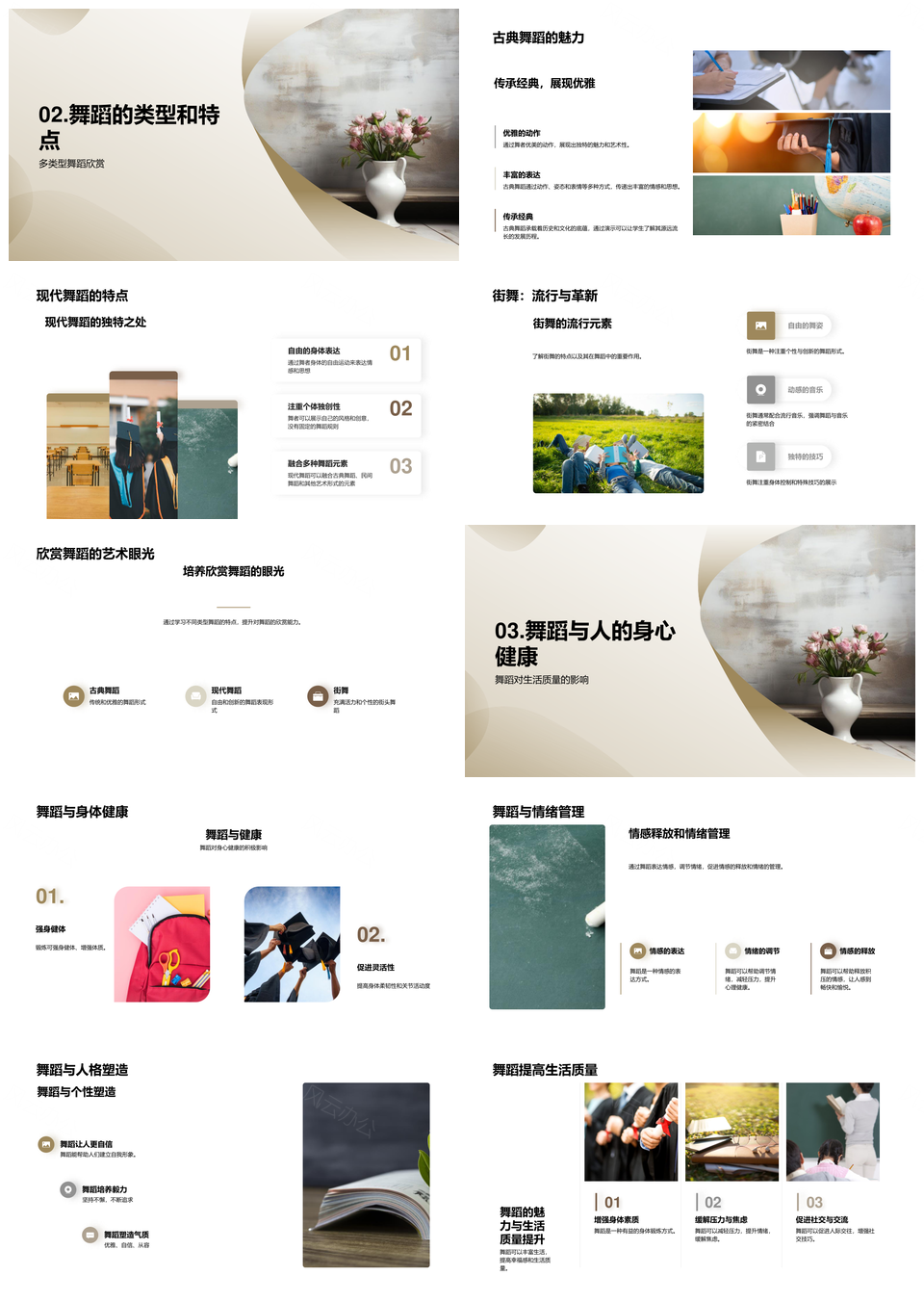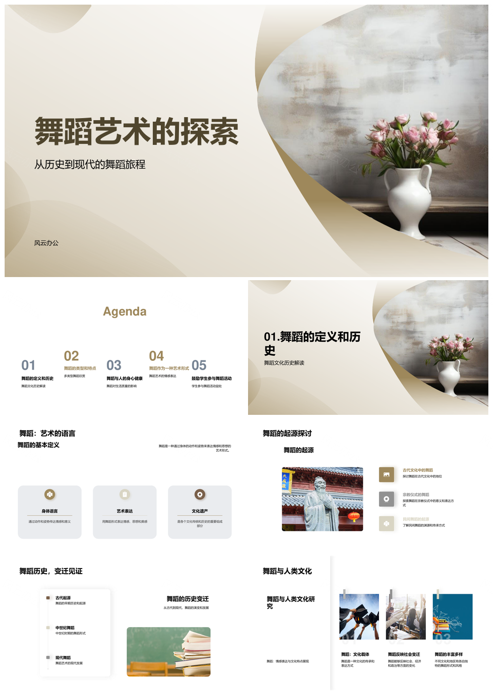 风云办公提供的舞蹈艺术历史类型健康赏析PPT模板,下载格式为pptx,一共28页,作品中文字及图均可以修改和编辑,图片更改请在作品中右键图片并更换,文字修改请直接点击文字进行修改。