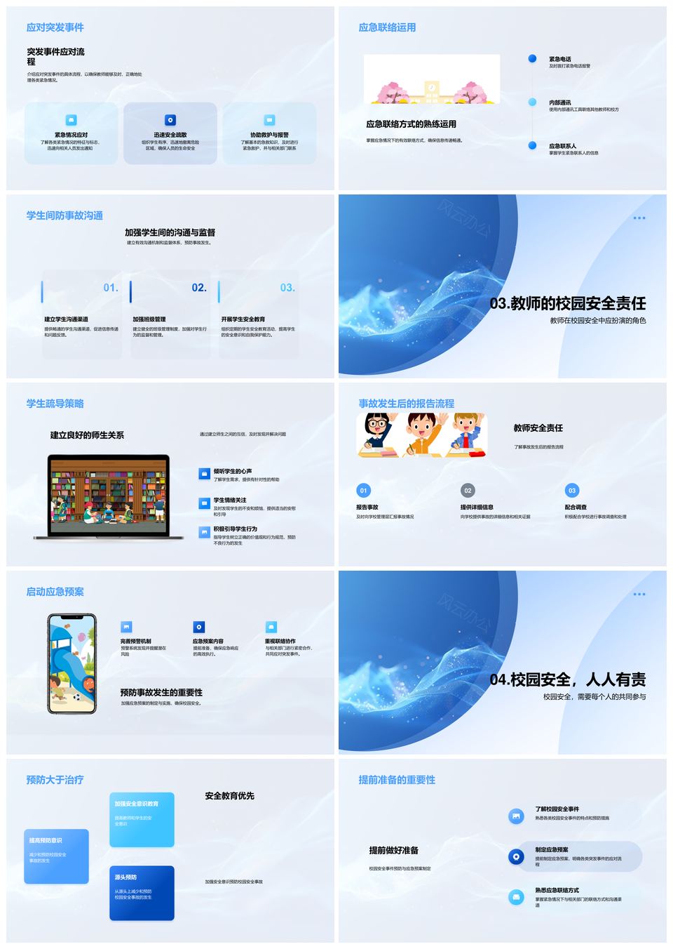 这是一张校园安全教师教育培训预防应对应急联络PPT模板,包含校园、安全、教师、教育、培训、预防、应对、应急、联络等主题内容,也可用作教育培训预防应对应急联络、校园安全教育培训预防应对、教师教育培训预防应对、教育培训预防应对应急、培训预防应对应急联络、校园安全教师教育培训、预防应对应急联络处理、校园安全教育培训预防、教育培训预防应对联络、教师教育预防应对应急、校园安全预防应对应急、预防应对应急联络措施、教育培训应急联络处理、校园安全教师教育、教育培训预防应对等PPT场景使用。 风云办公提供的校园安全教师教育培训预防应对应急联络PPT模板,下载格式为pptx,一共23页,作品中文字及图均可以修改和编辑,图片更改请在作品中右键图片并更换,文字修改请直接点击文字进行修改。