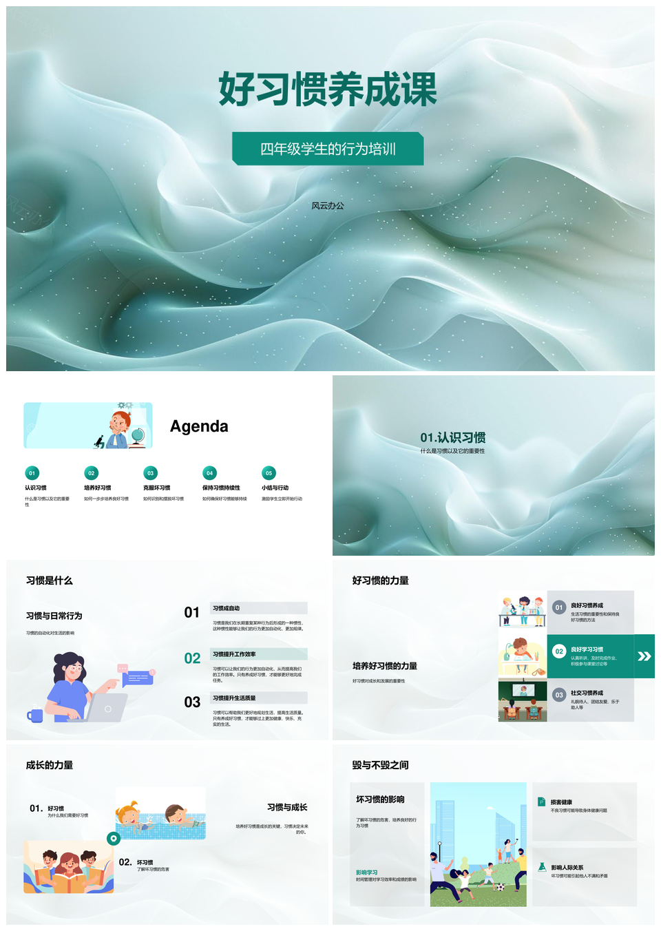 风云办公提供的四年级学生行为习惯培养目标教育课PPT模板,下载格式为pptx,一共33页,作品中文字及图均可以修改和编辑,图片更改请在作品中右键图片并更换,文字修改请直接点击文字进行修改。