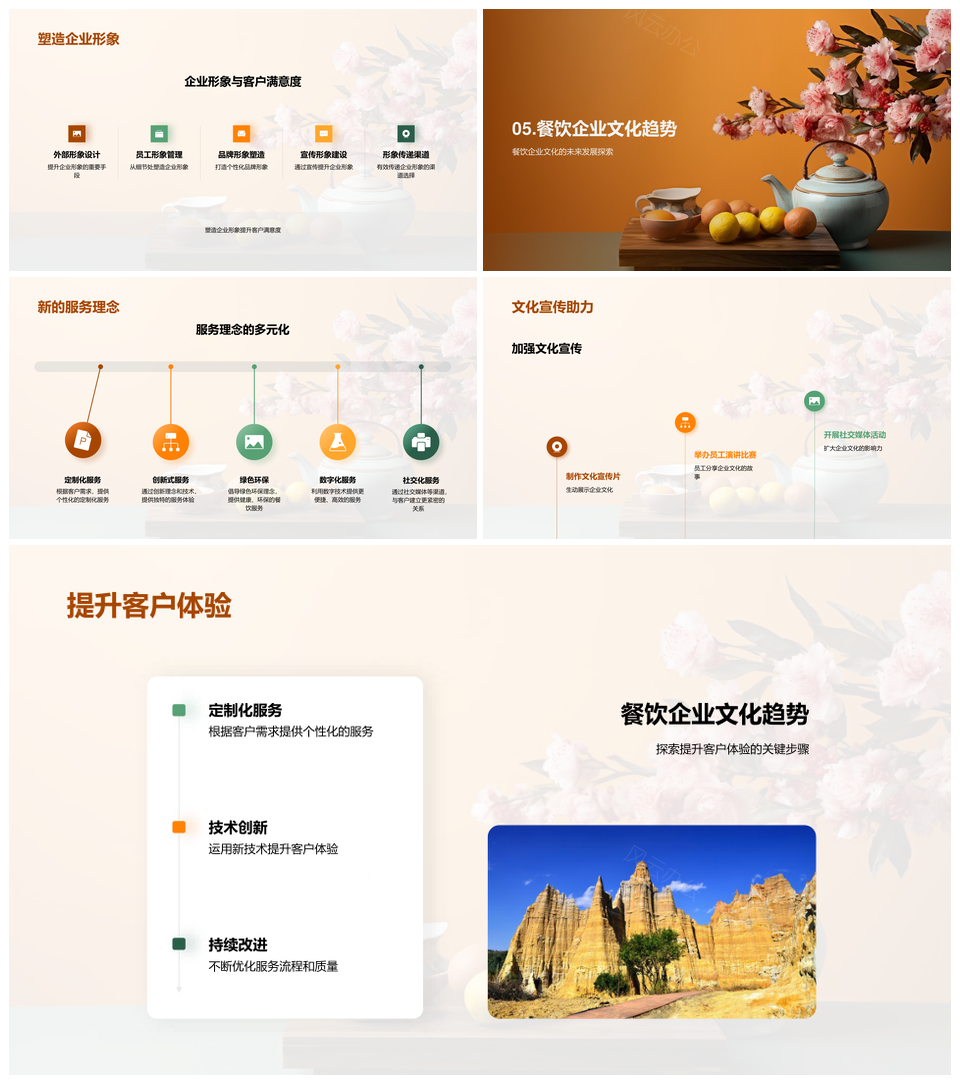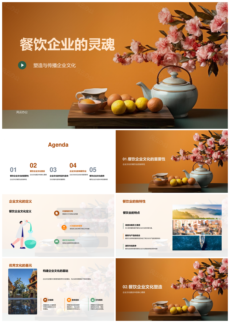风云办公提供的餐饮企业文化茶壶铸魂服务理念传扬PPT模板,下载格式为pptx,一共23页,作品中文字及图均可以修改和编辑,图片更改请在作品中右键图片并更换,文字修改请直接点击文字进行修改。
