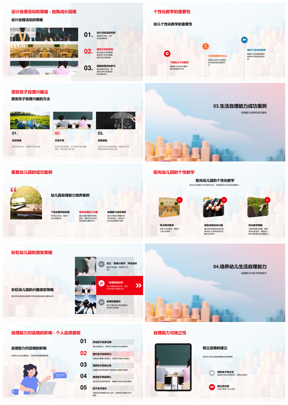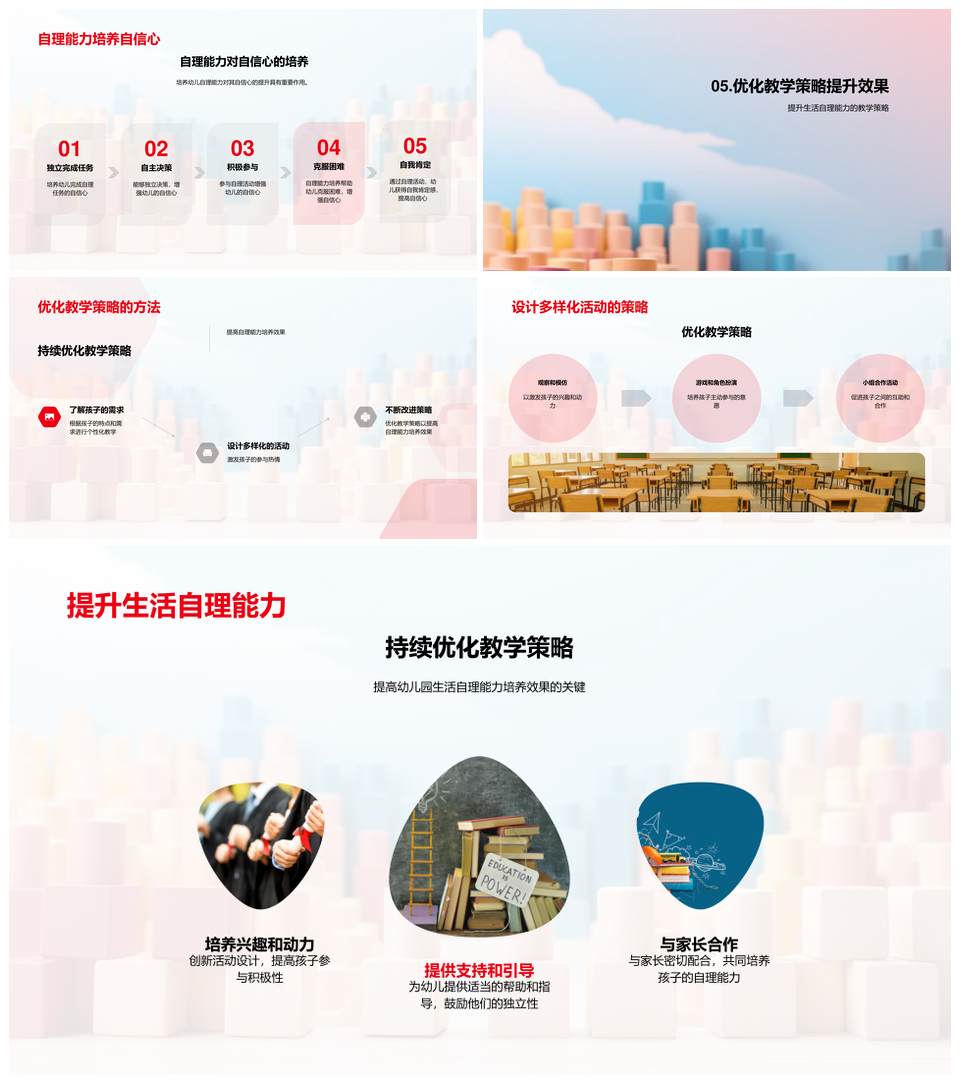 这是一张幼儿园教师研讨幼儿自理生活技能个性化教学PPT模板,包含幼儿园教师、研讨、幼儿、自理生活技能、个性化教学等主题内容,也可用作幼儿园教师研讨个性化教学、研讨幼儿自理生活技能、幼儿园教师研讨幼儿、教师研讨幼儿自理、幼儿园教师研讨、教师研讨幼儿、研讨幼儿自理、幼儿自理生活技能、自理生活技能个性化教学、幼儿园教师、教师研讨、研讨幼儿、幼儿自理、自理生活技能、生活技能个性化教学等PPT场景使用。 风云办公提供的幼儿园教师研讨幼儿自理生活技能个性化教学PPT模板,下载格式为pptx,一共23页,作品中文字及图均可以修改和编辑,图片更改请在作品中右键图片并更换,文字修改请直接点击文字进行修改。