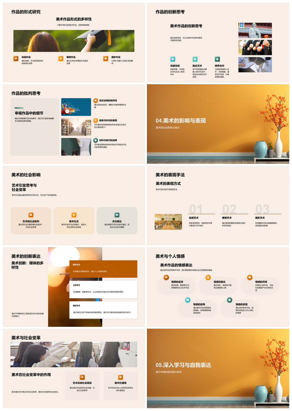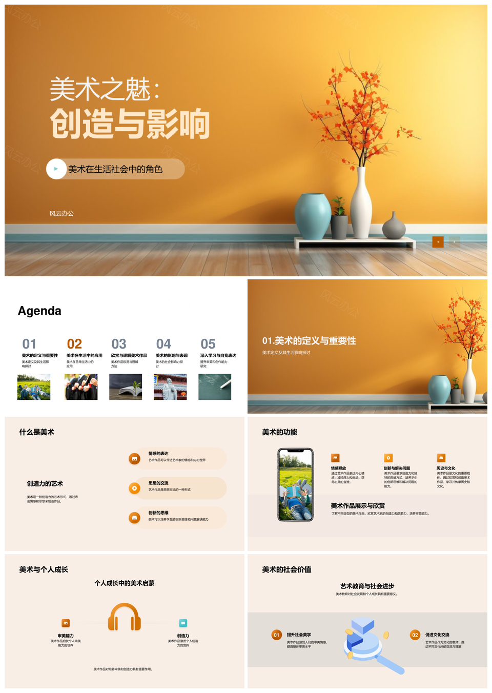这是一张美术创造影响生活社会艺术教学广告家居PPT模板,包含美术、创造、影响、生活、社会、艺术、教学、广告、家居等主题内容,也可用作美术创造影响生活社会、美术创造影响生活、创造影响生活社会、美术创造艺术教学、社会艺术教学广告、艺术教学广告家居、生活社会艺术教学、教学广告家居、美术创造、广告家居、艺术教学、社会艺术、影响生活、生活社会、创造影响等PPT场景使用。 风云办公提供的美术创造影响生活社会艺术教学广告家居PPT模板,下载格式为pptx,一共33页,作品中文字及图均可以修改和编辑,图片更改请在作品中右键图片并更换,文字修改请直接点击文字进行修改。