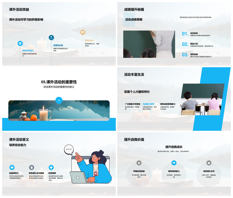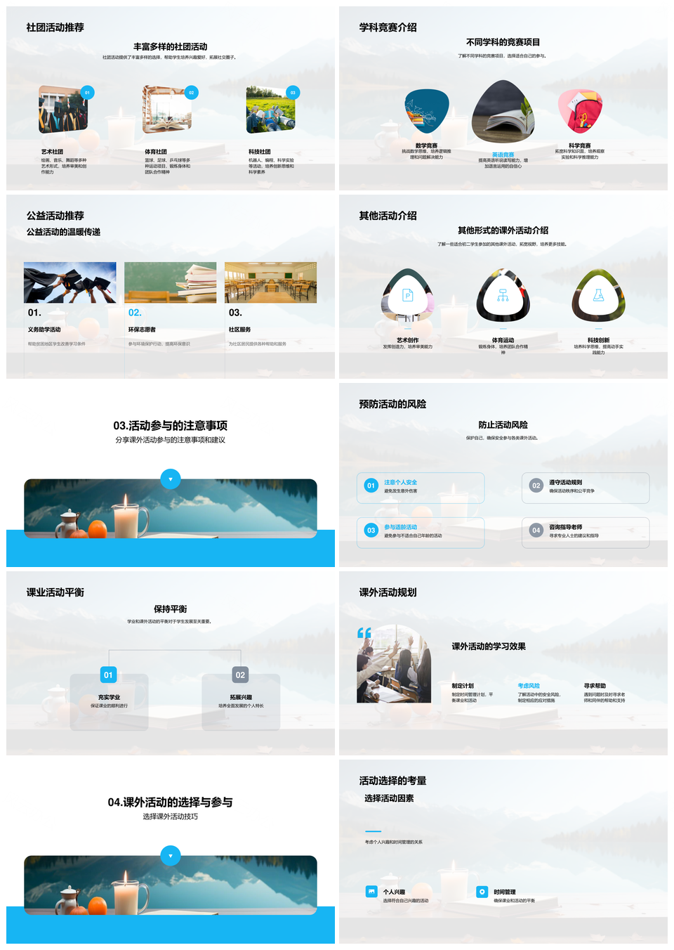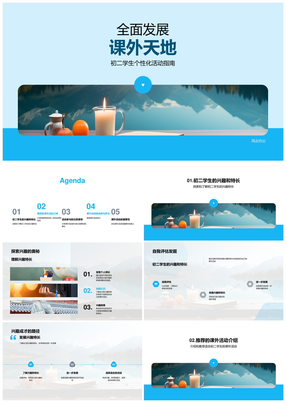 风云办公提供的初二学生个性化课外活动发展指南PPT模板,下载格式为pptx,一共24页,作品中文字及图均可以修改和编辑,图片更改请在作品中右键图片并更换,文字修改请直接点击文字进行修改。