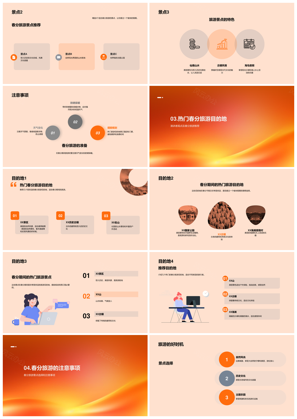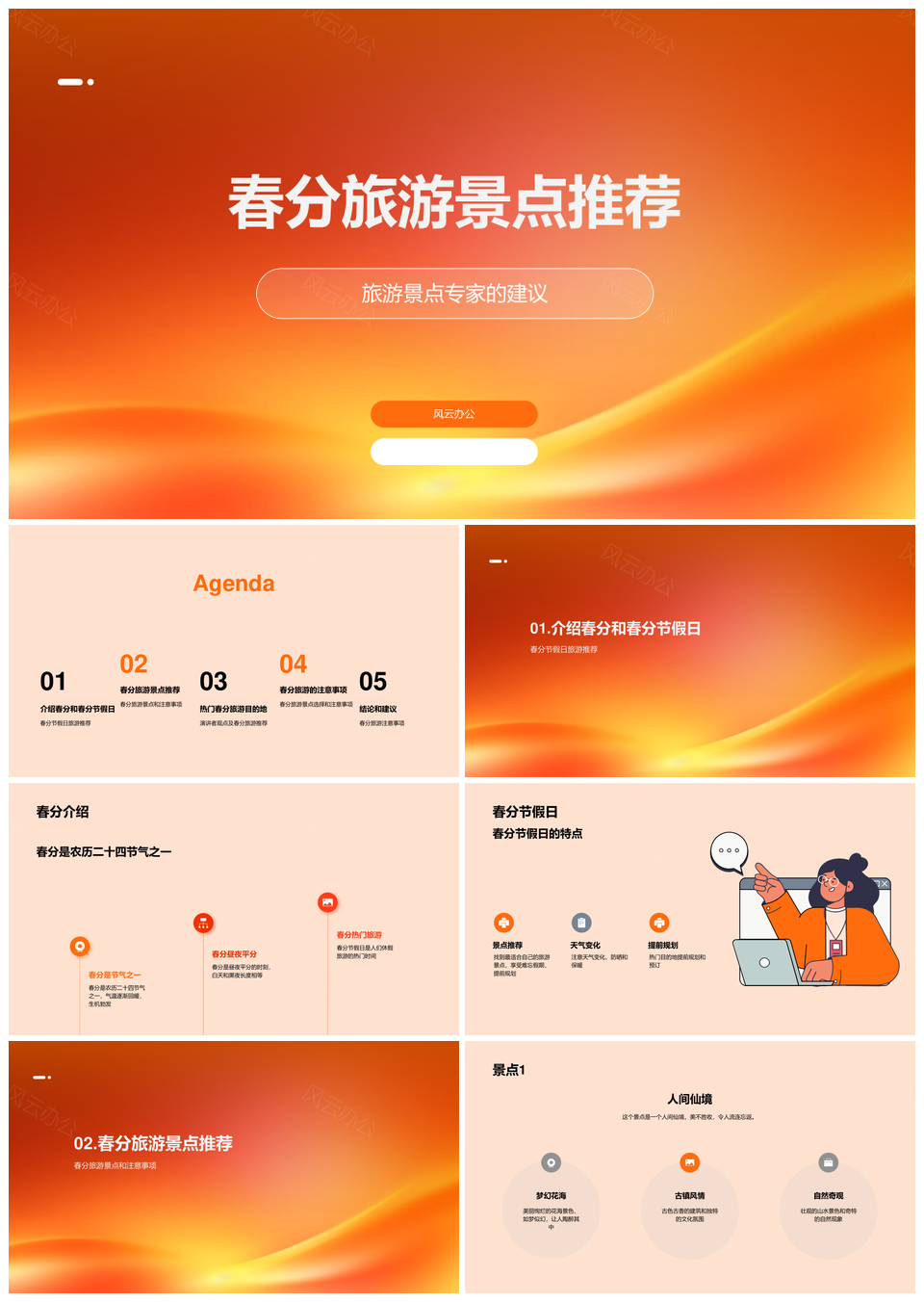 这是一张春分旅游景点推荐PPT模板,包含春分、旅游景点、推荐等主题内容,也可用作春分旅游景点推荐、春分旅游景点、春分景点推荐、旅游景点推荐、春分旅游推荐、春分旅游、春分景点、旅游景点、景点推荐、旅游推荐、春分推荐等PPT场景使用。 风云办公提供的春分旅游景点推荐PPT模板,下载格式为pptx,一共26页,作品中文字及图均可以修改和编辑,图片更改请在作品中右键图片并更换,文字修改请直接点击文字进行修改。