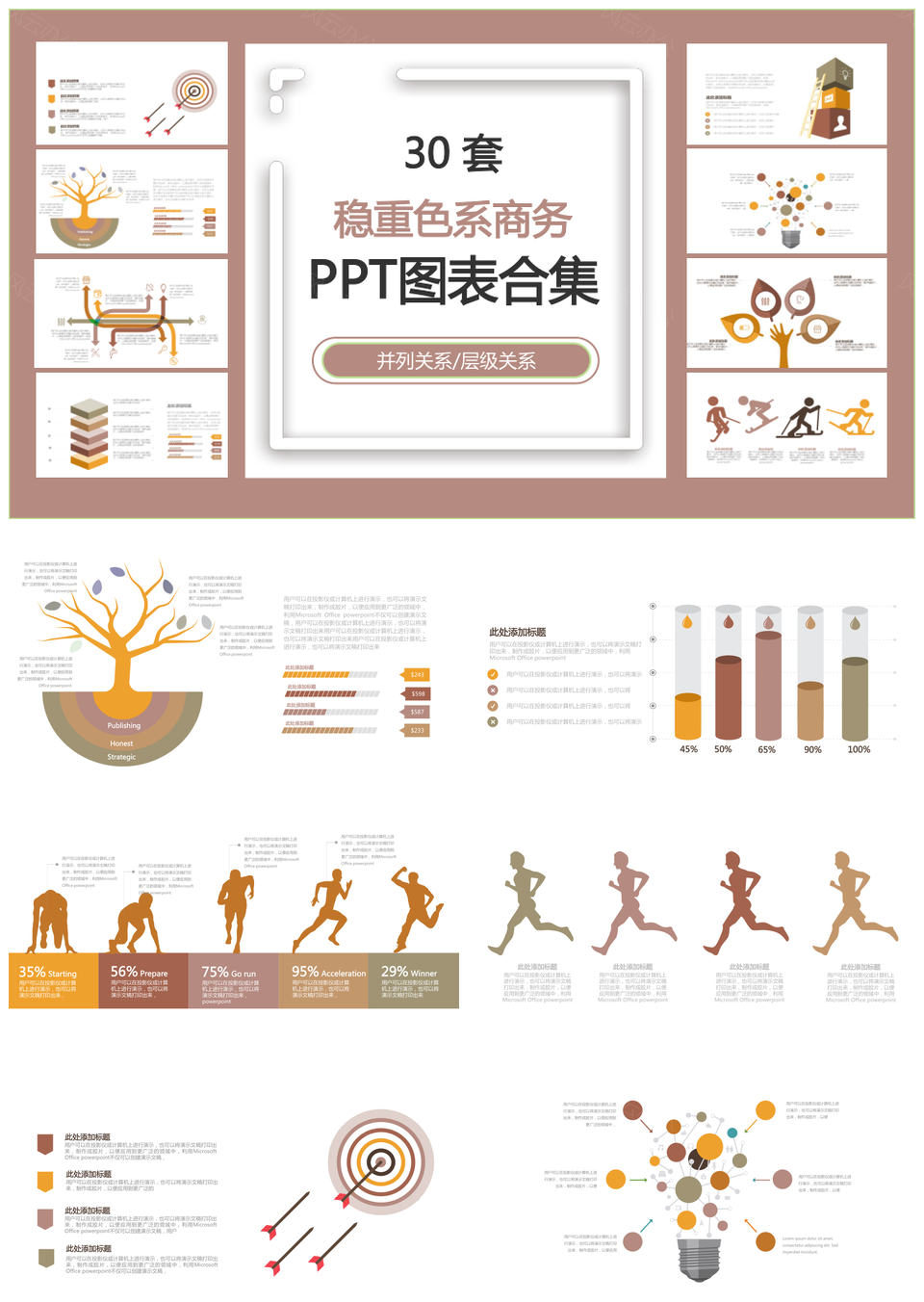 风云办公提供的稳重色系商务并列关系层级关系PPT图表合集,下载格式为pptx,一共31页,作品中文字及图均可以修改和编辑,图片更改请在作品中右键图片并更换,文字修改请直接点击文字进行修改。