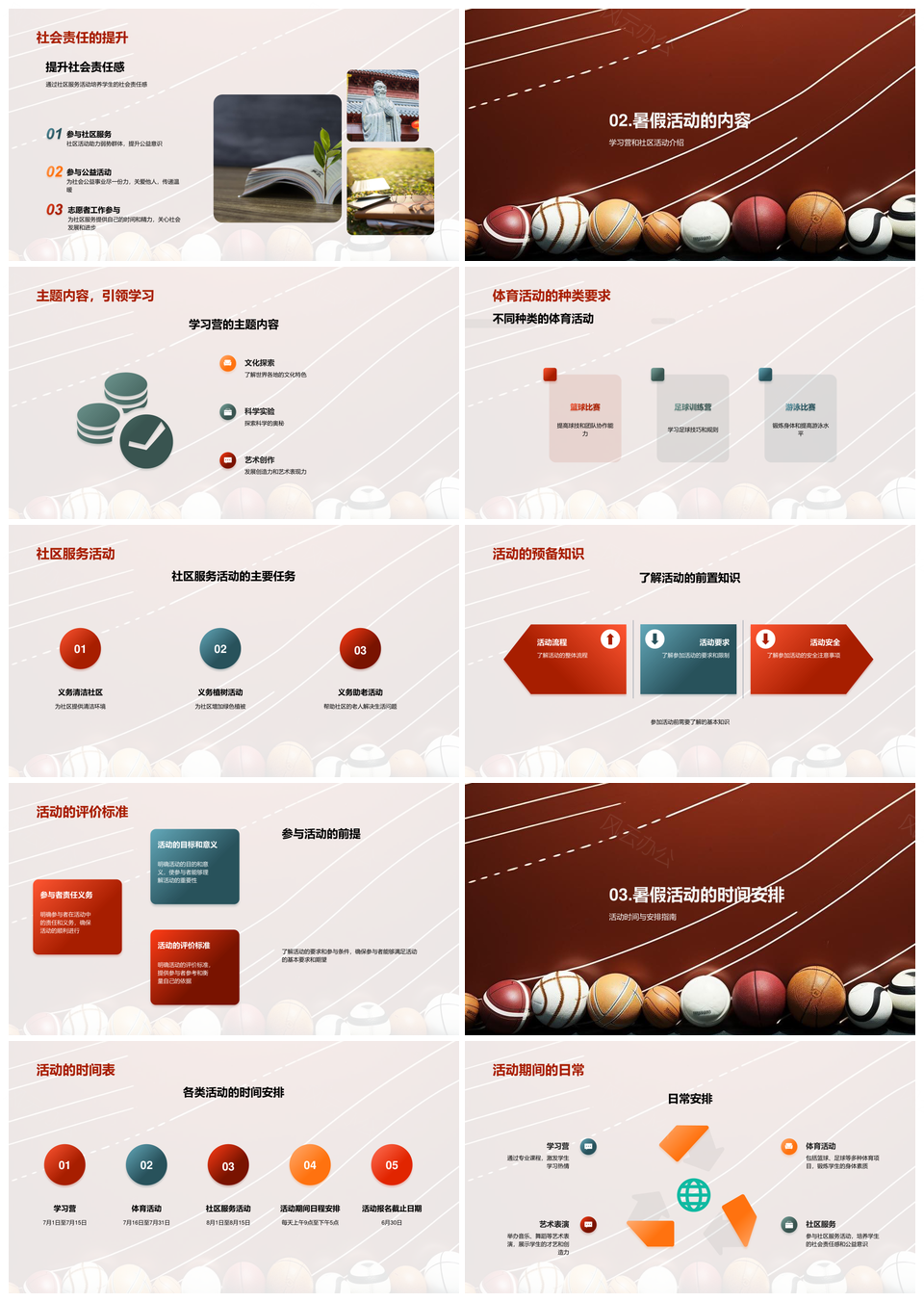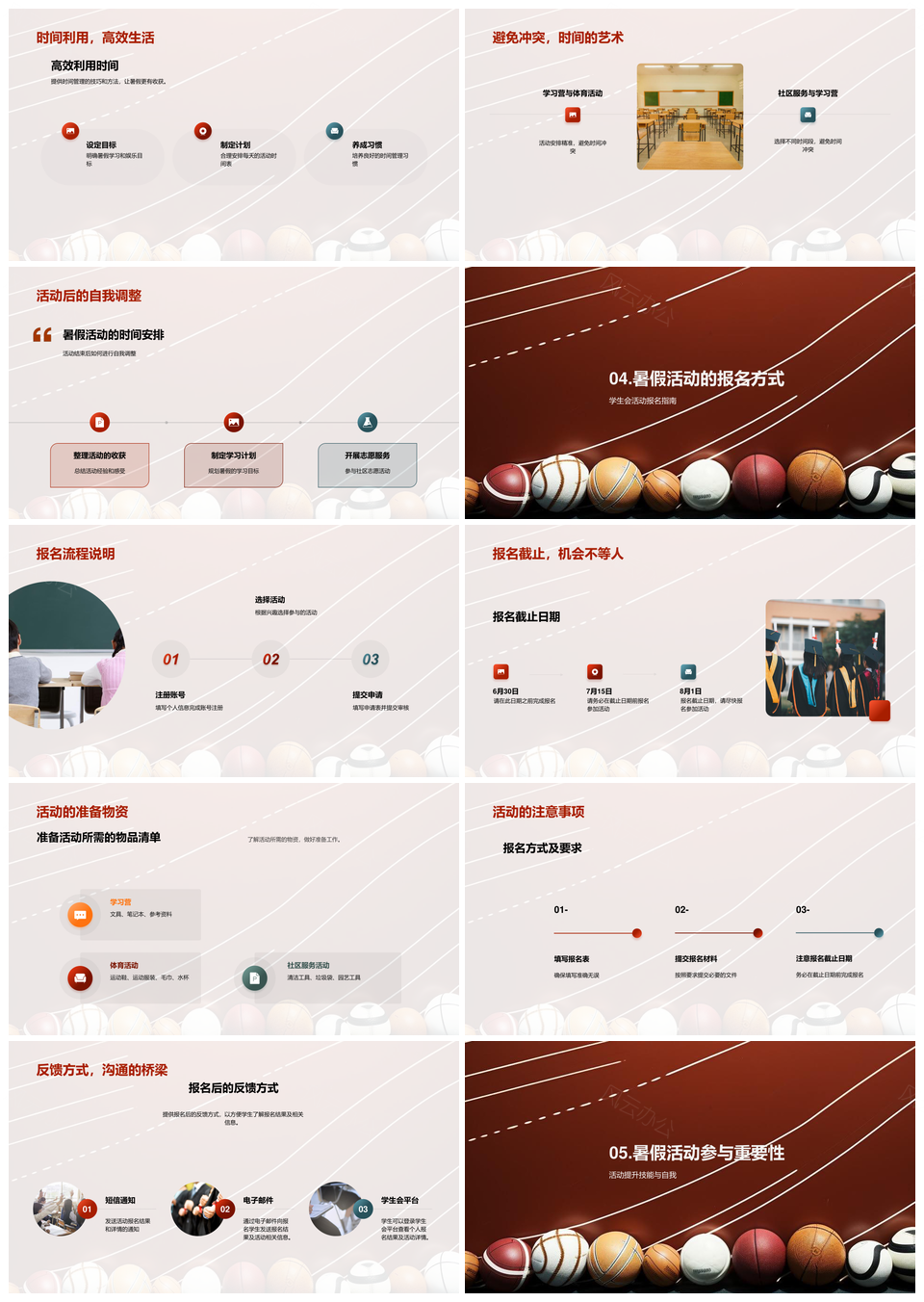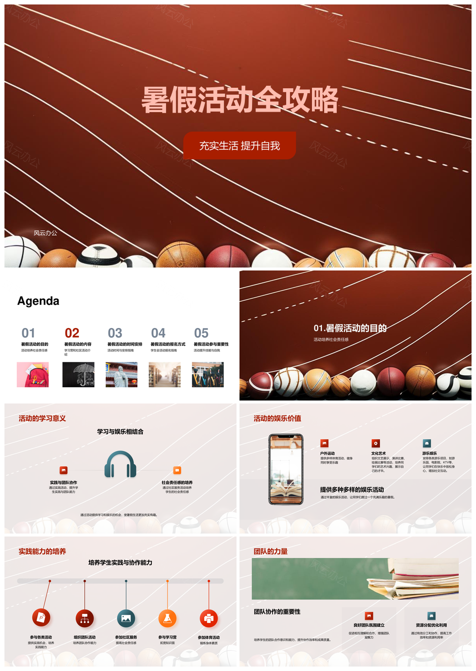 风云办公提供的暑假学习运动服务活动报名日历PPT模板,下载格式为pptx,一共33页,作品中文字及图均可以修改和编辑,图片更改请在作品中右键图片并更换,文字修改请直接点击文字进行修改。
