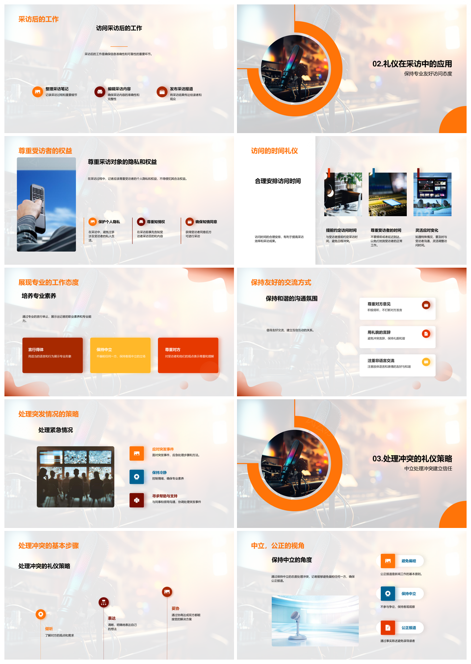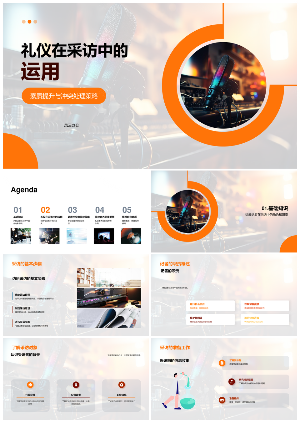 风云办公提供的新闻记者采访礼仪与冲突处理素质提升PPT模板,下载格式为pptx,一共33页,作品中文字及图均可以修改和编辑,图片更改请在作品中右键图片并更换,文字修改请直接点击文字进行修改。