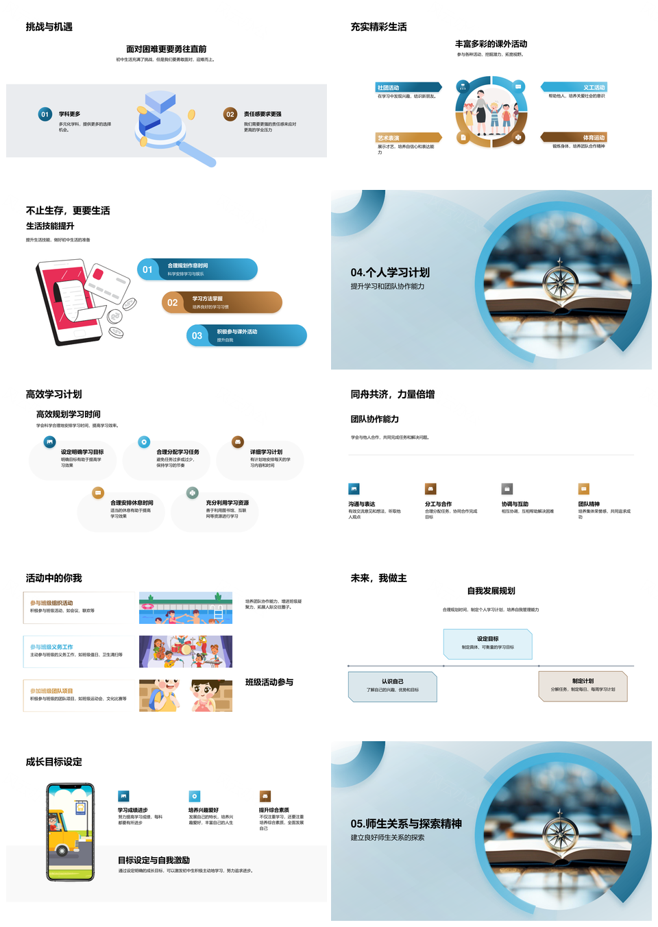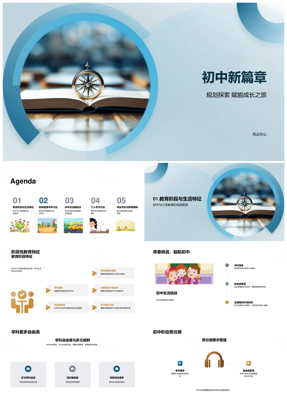 风云办公提供的初中新篇章规划作息参与活动开卷成长PPT模板,下载格式为pptx,一共33页,作品中文字及图均可以修改和编辑,图片更改请在作品中右键图片并更换,文字修改请直接点击文字进行修改。