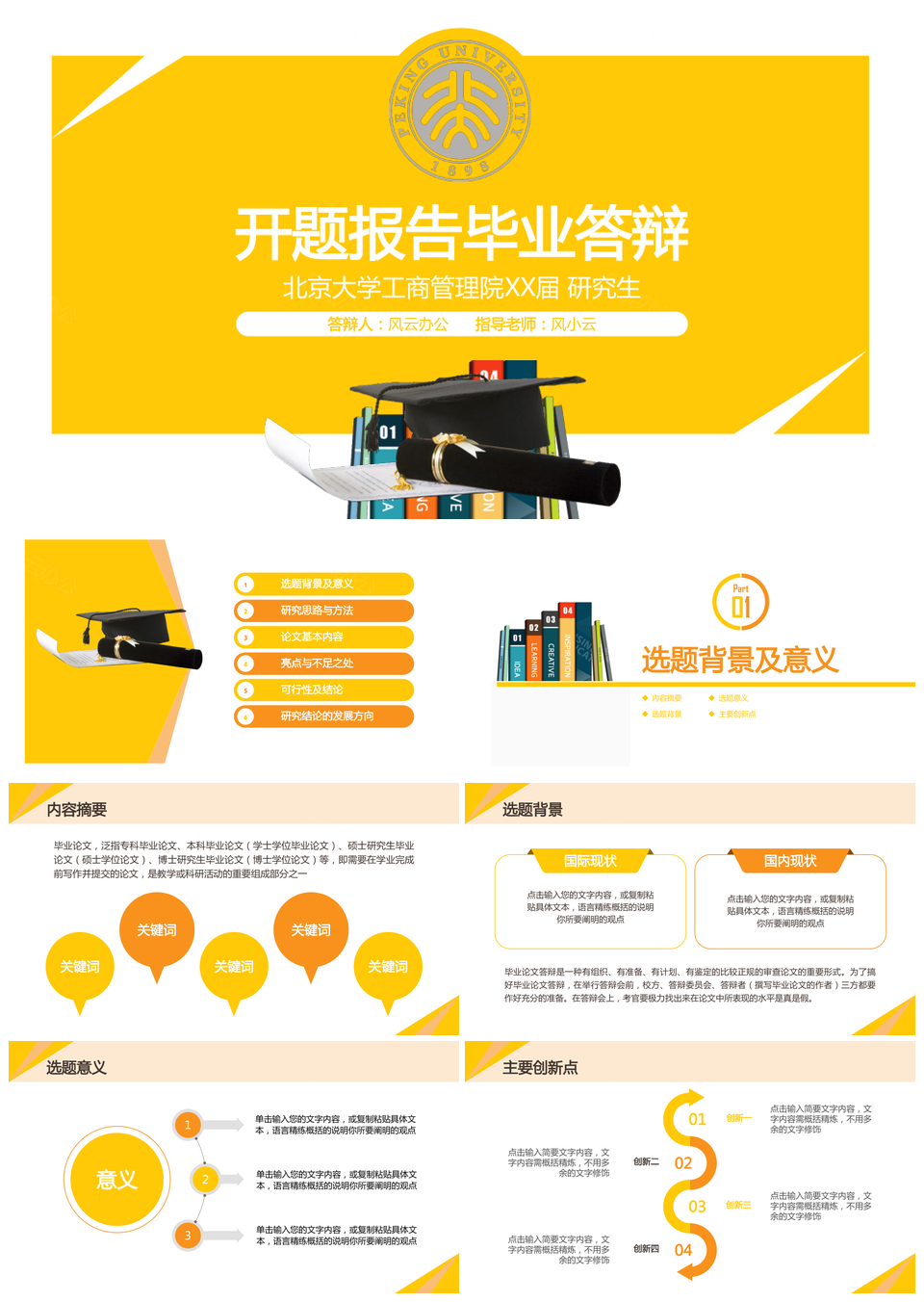 这是一张开题报告毕业答辩通用PPT模板,包含开题报告、毕业答辩等主题内容,也可用作开题、报告、毕业、答辩 开题报告毕业答辩、报告毕业答辩、开题报告、毕业答辩等PPT场景使用。 风云办公提供的开题报告毕业答辩通用PPT模板,下载格式为pptx,一共20页,作品中文字及图均可以修改和编辑,图片更改请在作品中右键图片并更换,文字修改请直接点击文字进行修改。