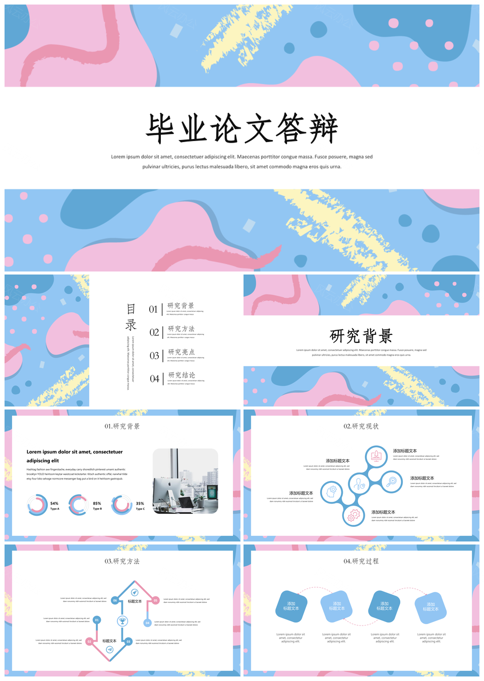 风云办公提供的简约风彩色小清新几何毕业论文答辩PPT模板,下载格式为pptx,一共10页,作品中文字及图均可以修改和编辑,图片更改请在作品中右键图片并更换,文字修改请直接点击文字进行修改。