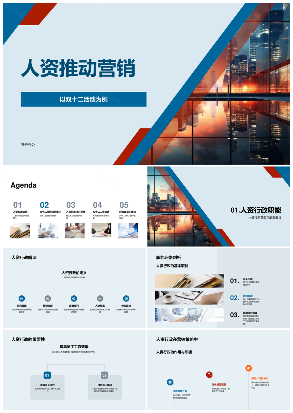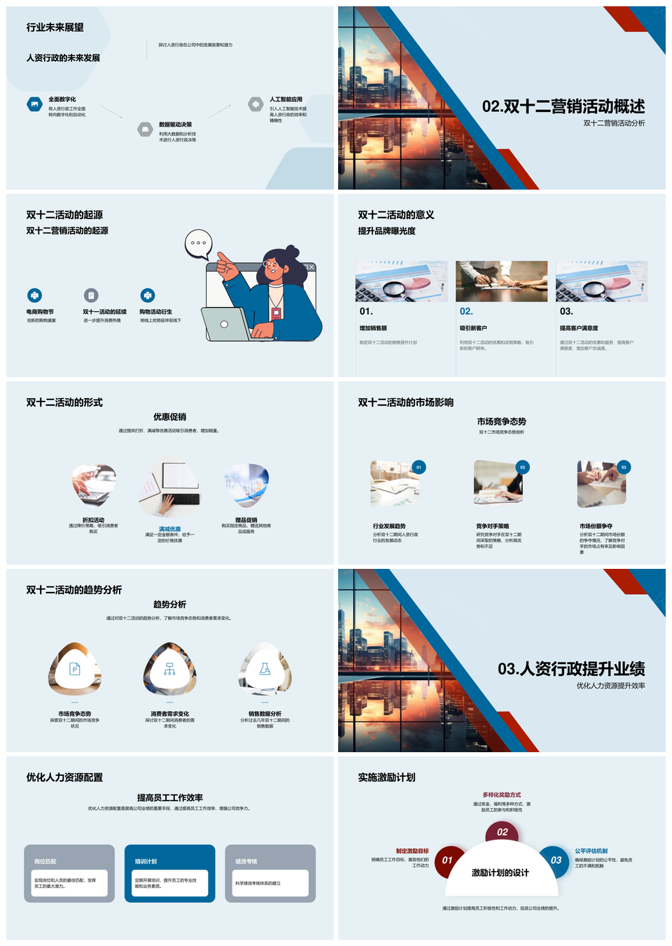这是一张人资行政双十二营销策划优化配置提业绩PPT模板,包含人资、行政、双十二、营销策划、优化、配置、提业绩等主题内容,也可用作人资行政双十二营销策划、人资行政双十二优化配置、双十二营销策划优化配置、行政双十二营销策划优化、人资行政优化配置提业绩、双十二营销策划提业绩、营销策划优化配置提业绩、行政优化配置提业绩、双十二营销策划优化、营销策划优化配置、优化配置提业绩、人资行政双十二、双十二营销策划、营销策划优化、优化配置等PPT场景使用。 风云办公提供的人资行政双十二营销策划优化配置提业绩PPT模板,下载格式为pptx,一共33页,作品中文字及图均可以修改和编辑,图片更改请在作品中右键图片并更换,文字修改请直接点击文字进行修改。