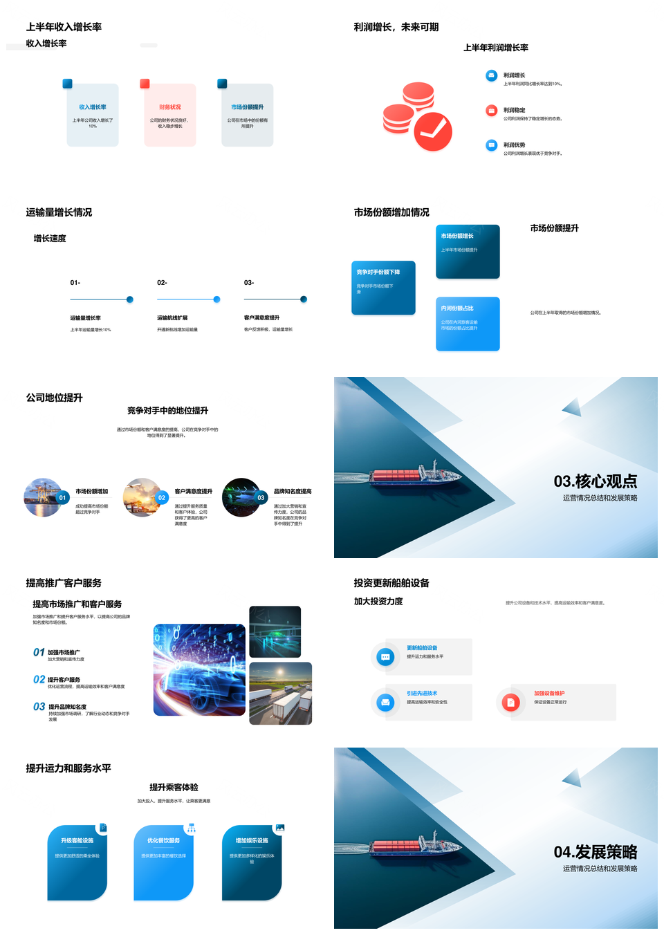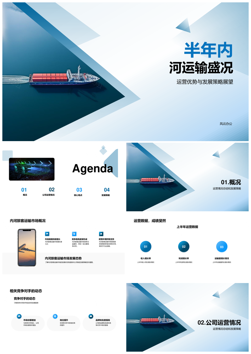 风云办公提供的内河运输上半年运营总结与发展策略PPT模板,下载格式为pptx,一共24页,作品中文字及图均可以修改和编辑,图片更改请在作品中右键图片并更换,文字修改请直接点击文字进行修改。