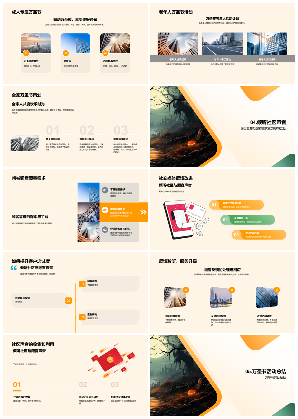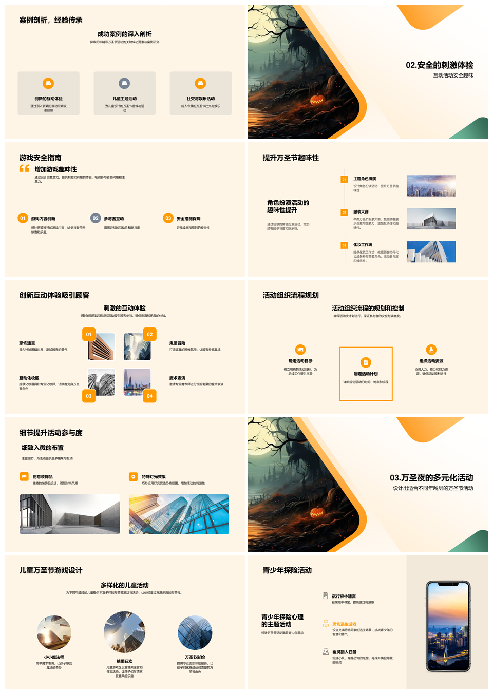 这是一张万圣节活动策划创新互动游戏安全角色扮演顾客体验南瓜灯问卷PPT模板,包含万圣节、活动、策划、创新、互动游戏、安全、角色扮演、顾客、体验、南瓜灯、问卷等主题内容,也可用作万圣节活动策划创新互动游戏、互动游戏角色扮演顾客体验南瓜灯、安全角色扮演顾客体验南瓜灯、万圣节活动策划角色扮演南瓜灯、顾客体验南瓜灯问卷安全、万圣节活动策划创新互动、创新互动游戏安全问卷、角色扮演顾客体验南瓜灯、互动游戏安全顾客体验、活动策划创新角色扮演、南瓜灯问卷安全体验、万圣节角色扮演南瓜灯、安全问卷顾客体验、万圣节创新互动游戏、顾客体验南瓜灯等PPT场景使用。 风云办公提供的万圣节活动策划创新互动游戏安全角色扮演顾客体验南瓜灯问卷PPT模板,下载格式为pptx,一共33页,作品中文字及图均可以修改和编辑,图片更改请在作品中右键图片并更换,文字修改请直接点击文字进行修改。