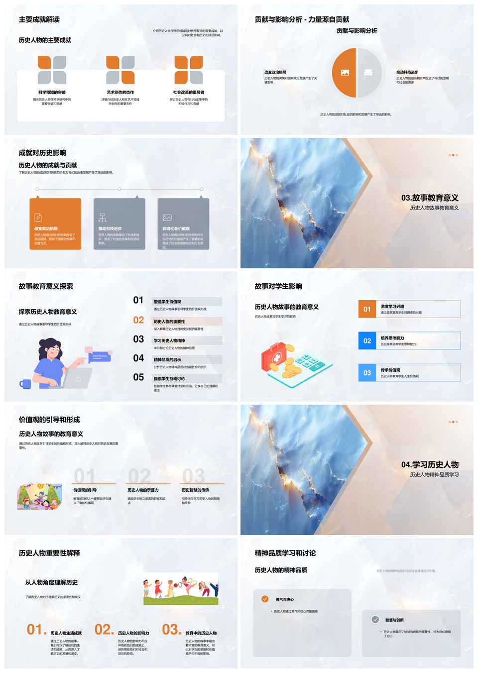 这是一张历史人物成就故事引导初中生价值观教育PPT模板,包含历史人物、成就、故事、引导、初中生、价值观、教育等主题内容,也可用作历史人物成就故事引导、历史人物成就故事、人物成就故事引导、成就故事引导初中生、成就故事引导、历史人物成就引导、故事引导初中生价值观、引导初中生价值观教育、历史成就故事教育、成就初中生价值观、初中生价值观教育、历史人物成就、成就故事引导教育、引导初中生教育、故事价值观教育等PPT场景使用。 风云办公提供的历史人物成就故事引导初中生价值观教育PPT模板,下载格式为pptx,一共23页,作品中文字及图均可以修改和编辑,图片更改请在作品中右键图片并更换,文字修改请直接点击文字进行修改。