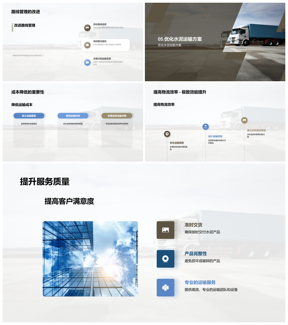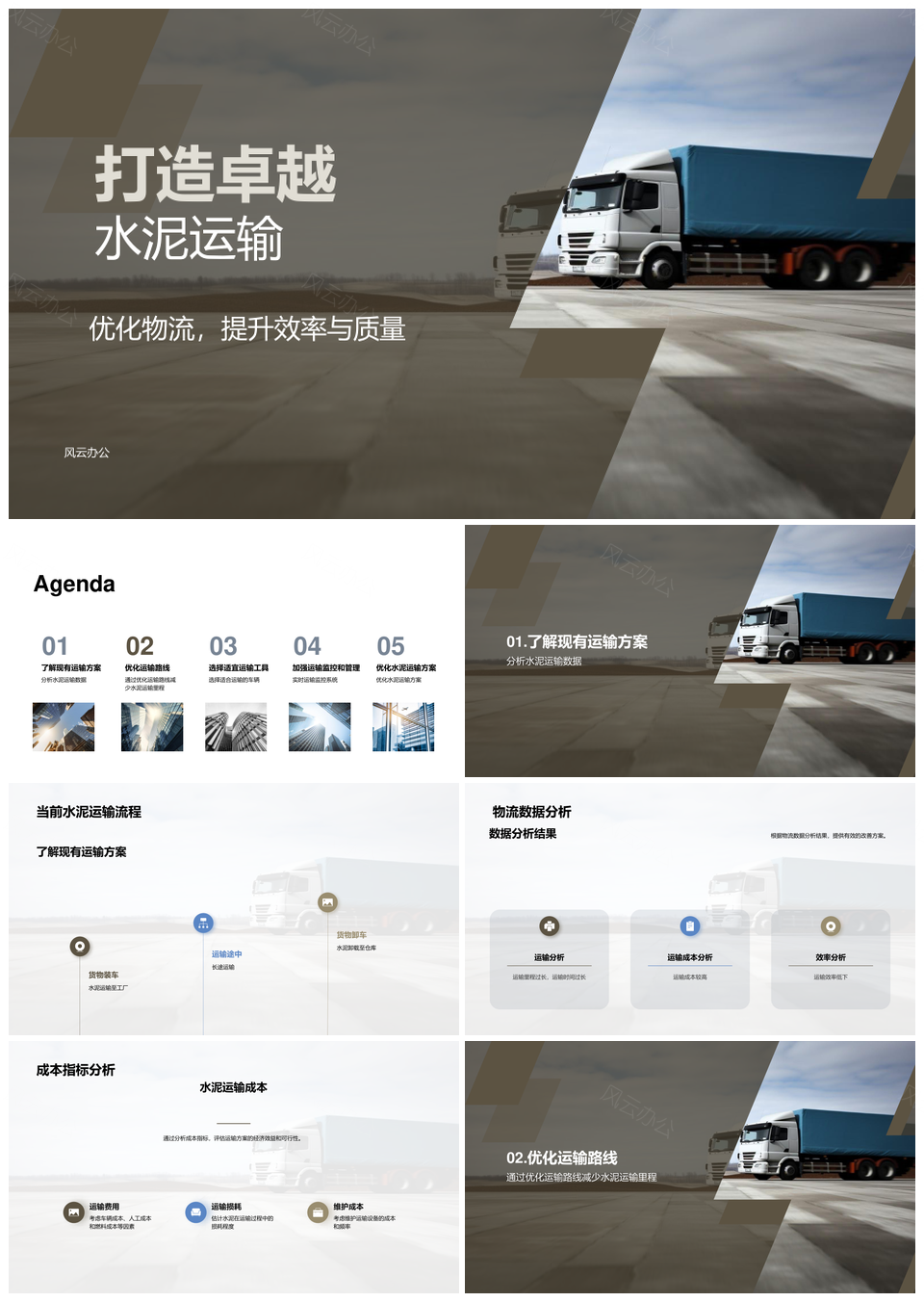 风云办公提供的物流经理优化水泥运输流程降本增效PPT模板,下载格式为pptx,一共23页,作品中文字及图均可以修改和编辑,图片更改请在作品中右键图片并更换,文字修改请直接点击文字进行修改。