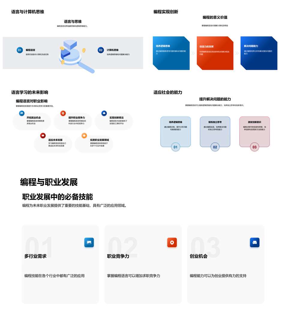 这是一张编程语言学习路径CJavaPython未来应用活力PPT模板,包含编程语言、学习路径、C、Java、Python、未来应用、活力等主题内容,也可用作编程语言学习路径CJavaPython未来应用、编程语言学习路径CJavaPython、学习路径CJavaPython未来应用活力、CJavaPython未来应用活力、编程语言学习路径未来应用活力、编程语言CJavaPython未来应用、学习路径CJavaPython未来应用、编程语言学习路径CJava、编程语言CJavaPython、学习路径未来应用活力、CJavaPython未来应用、编程语言未来应用活力、CJavaPython、未来应用活力、学习路径CJavaPython等PPT场景使用。 风云办公提供的编程语言学习路径CJavaPython未来应用活力PPT模板,下载格式为pptx,一共33页,作品中文字及图均可以修改和编辑,图片更改请在作品中右键图片并更换,文字修改请直接点击文字进行修改。
