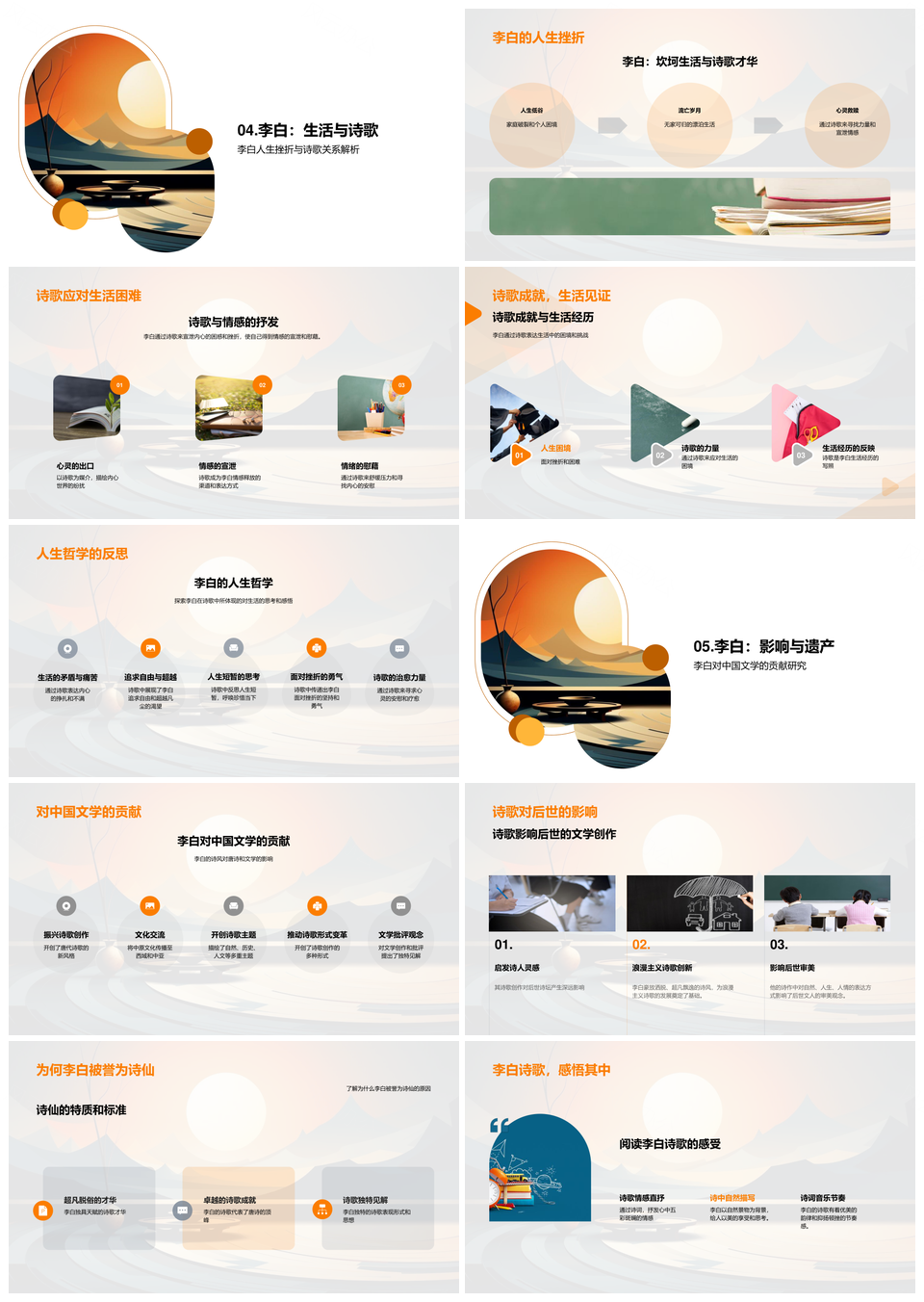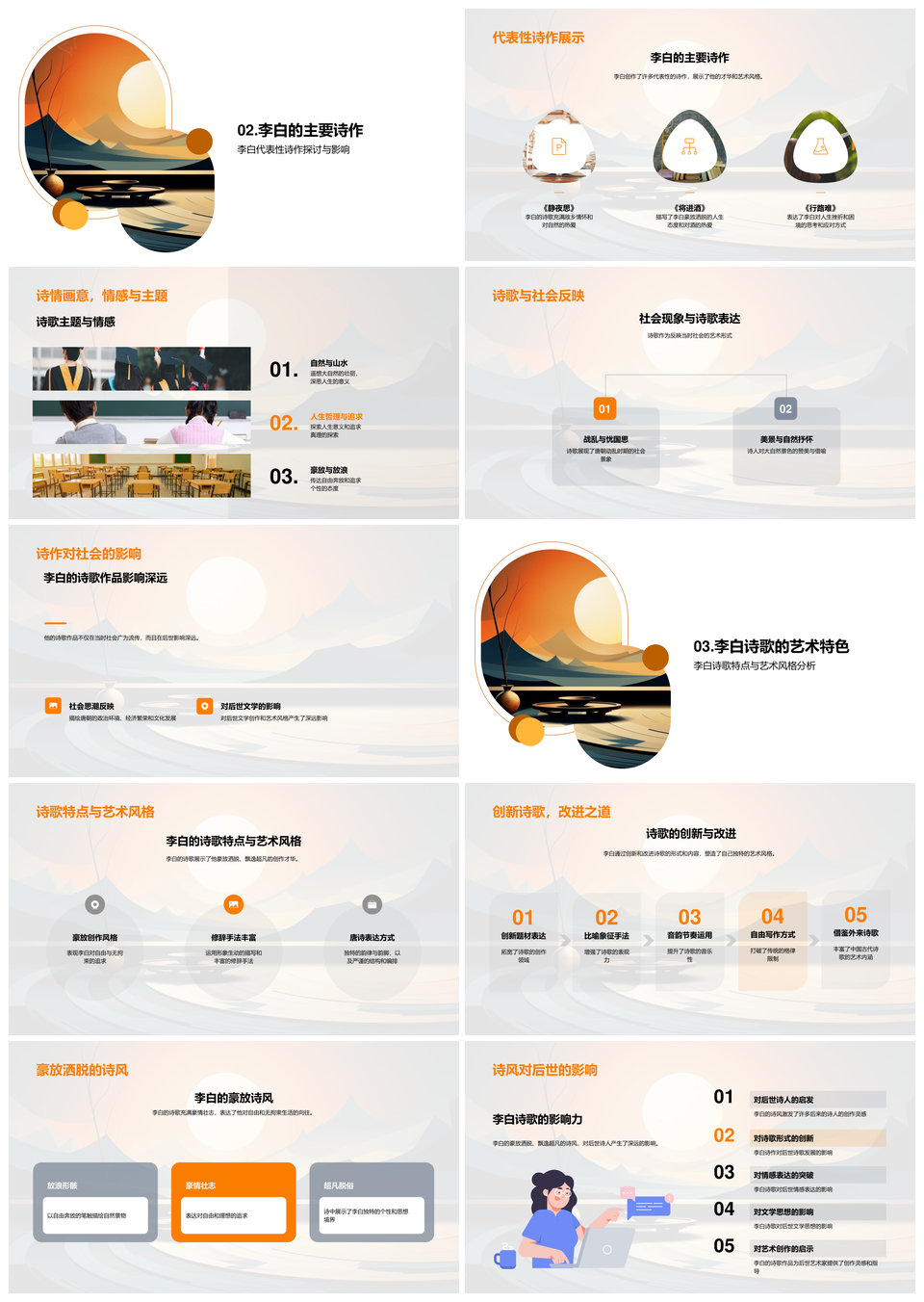 风云办公提供的李白诗仙唐朝艺术遗产诗作人生轨迹PPT模板,下载格式为pptx,一共28页,作品中文字及图均可以修改和编辑,图片更改请在作品中右键图片并更换,文字修改请直接点击文字进行修改。