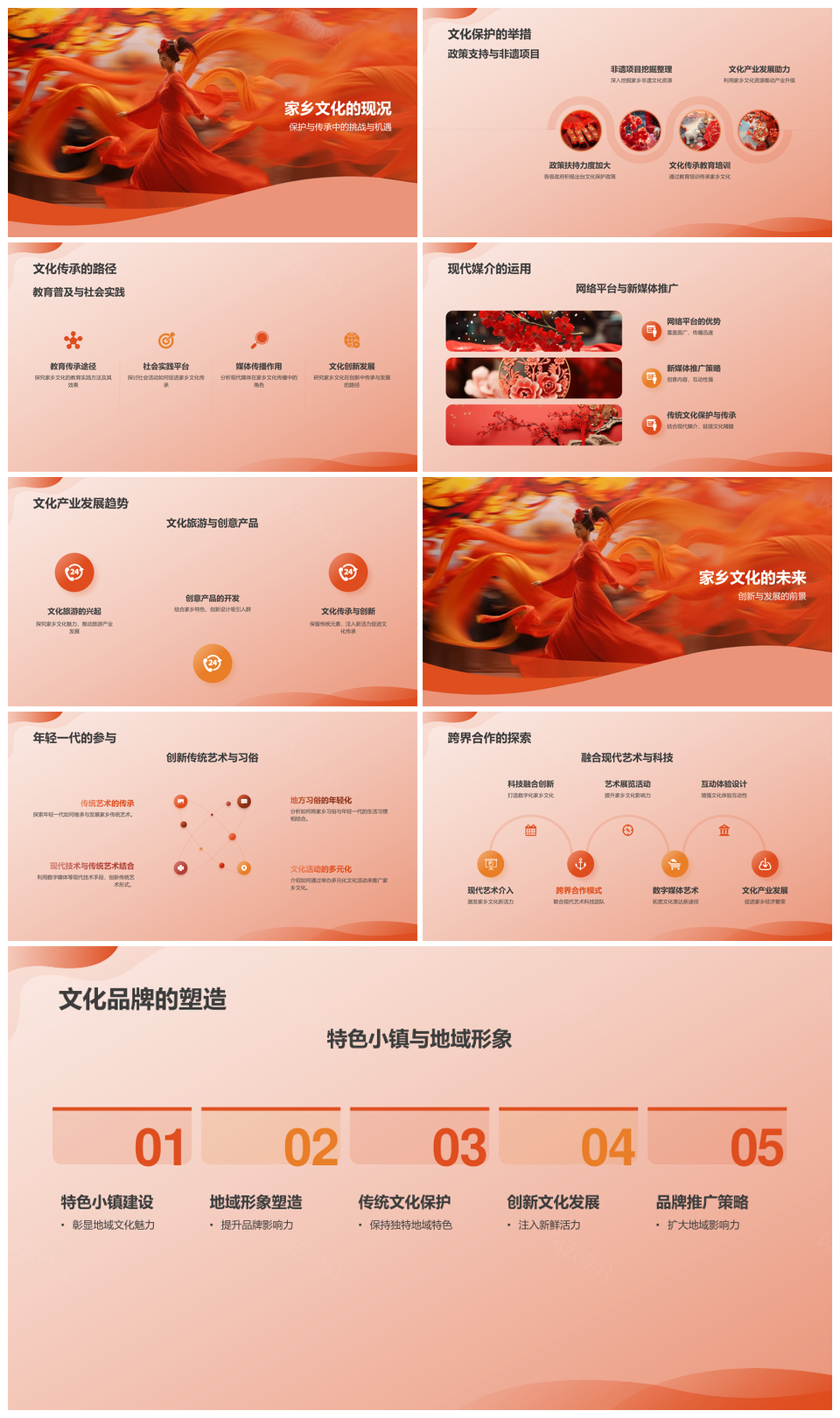 此模板以中国风美学为基底,采用正红主色调传递节日氛围,设计中融入复古雕花纹样与书法水墨元素,搭配留白技法构建视觉层次。版面布局兼顾文艺气息与现代简约感,传统灯笼、瑞兽等图形经过扁平化处理,既保留文化意蕴又符合商务场景需求。标题字体参考古籍刻本字形,正文采用衬线字体提升可读性,通过黄金比例构图强化专业调性。适用于企业节庆汇报、文化主题活动等场景,支持灵活调整配色与元素组合,兼顾文化厚度与创意表达。