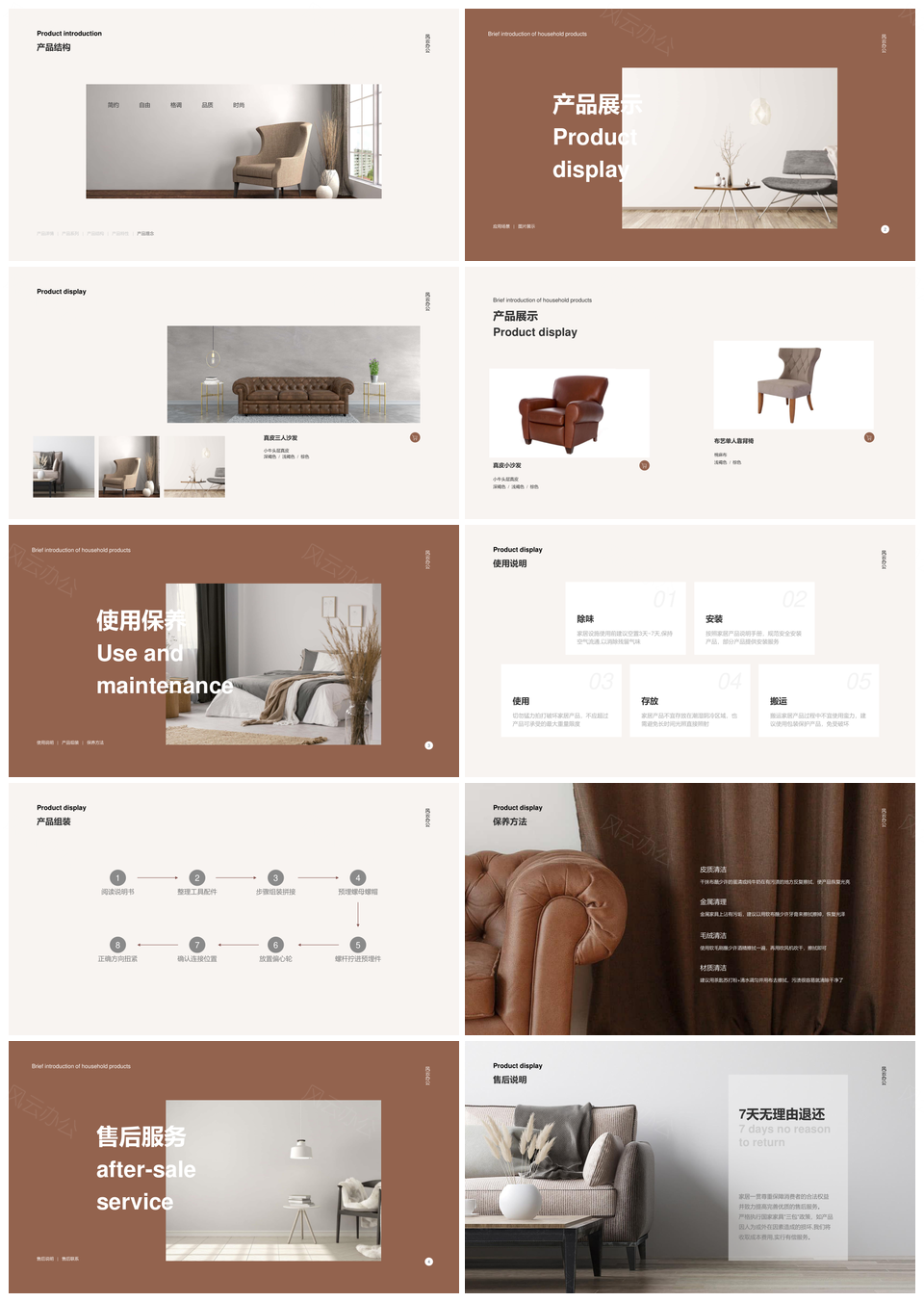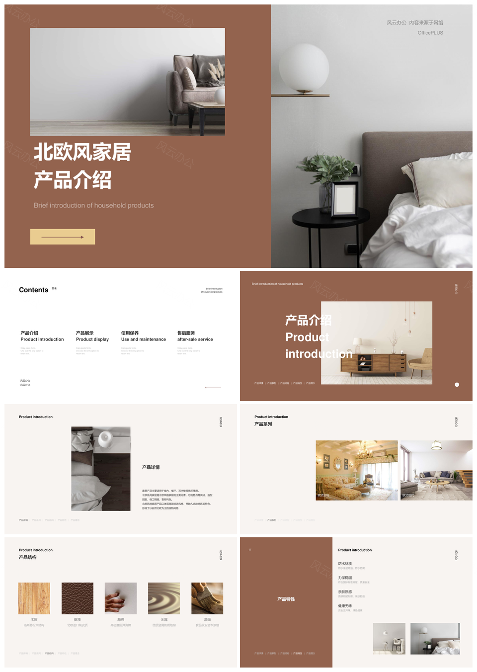 风云办公提供的北欧棕白莫兰迪家具产品展示保养介绍PPT模板,下载格式为pptx,一共19页,作品中文字及图均可以修改和编辑,图片更改请在作品中右键图片并更换,文字修改请直接点击文字进行修改。