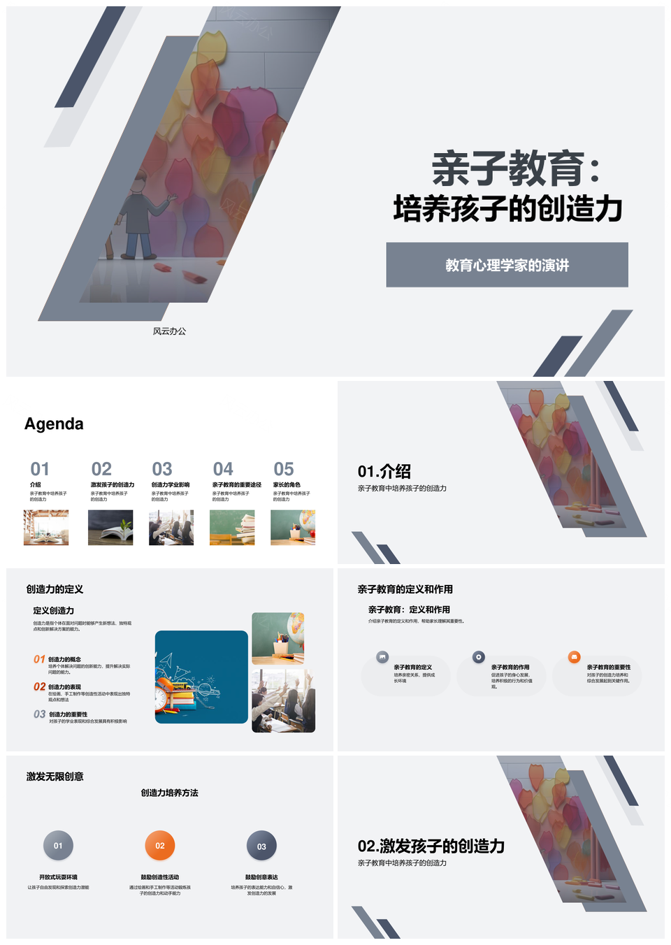 风云办公提供的教育心理学家解析亲子教育创造力培养PPT模板,下载格式为pptx,一共20页,作品中文字及图均可以修改和编辑,图片更改请在作品中右键图片并更换,文字修改请直接点击文字进行修改。