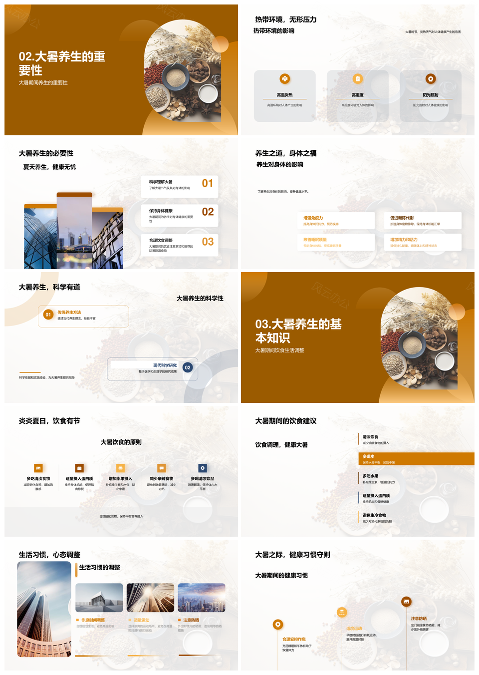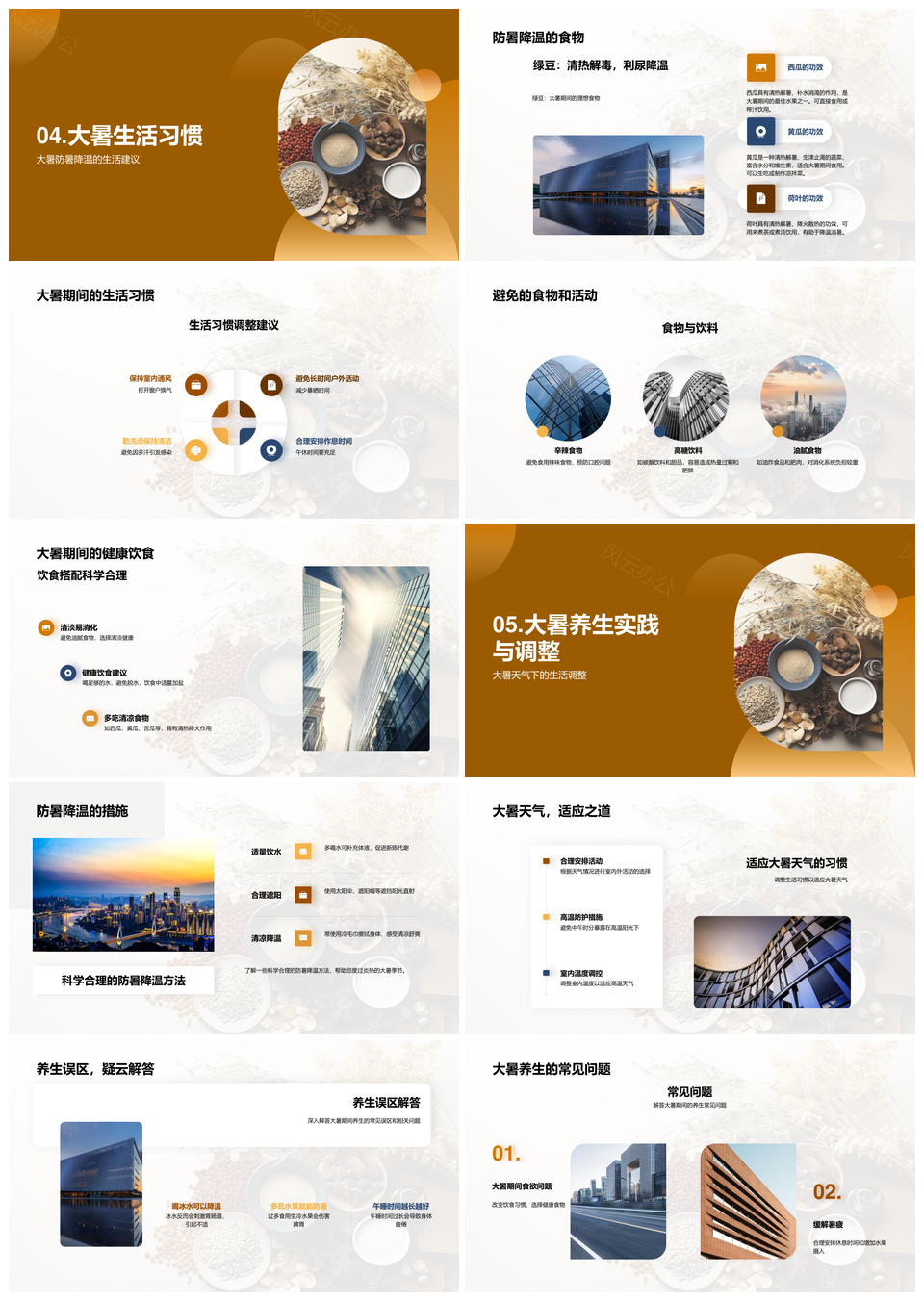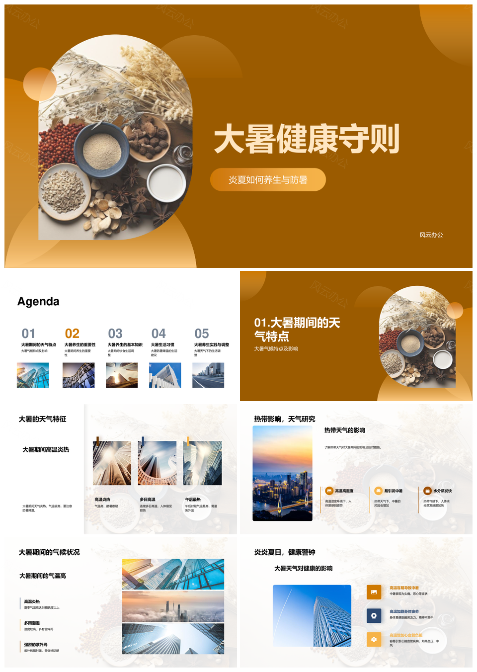 风云办公提供的大暑养生防暑饮食生活中药指南PPT模板,下载格式为pptx,一共28页,作品中文字及图均可以修改和编辑,图片更改请在作品中右键图片并更换,文字修改请直接点击文字进行修改。