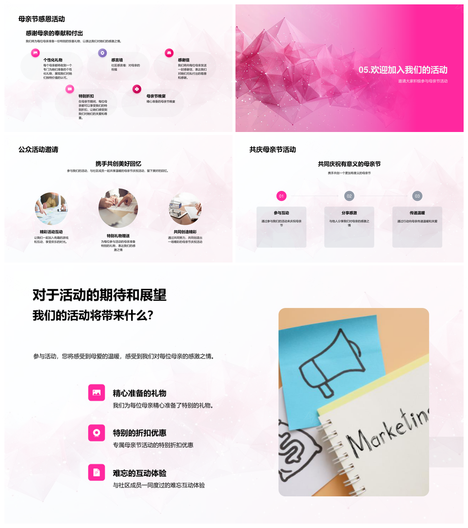这是一张母亲节品牌社区活动回馈传递母爱特色PPT模板,包含母亲节、品牌、社区、活动、回馈、传递、母爱、特色等主题内容,也可用作母亲节品牌社区活动回馈传递母爱特色、母亲节品牌社区活动、品牌社区活动回馈、社区活动回馈传递、活动回馈传递母爱、回馈传递母爱特色、母亲节品牌社区、品牌社区活动、社区活动回馈、活动回馈传递、回馈传递母爱、传递母爱特色、社区活动、活动回馈、回馈传递等PPT场景使用。