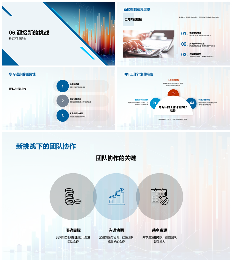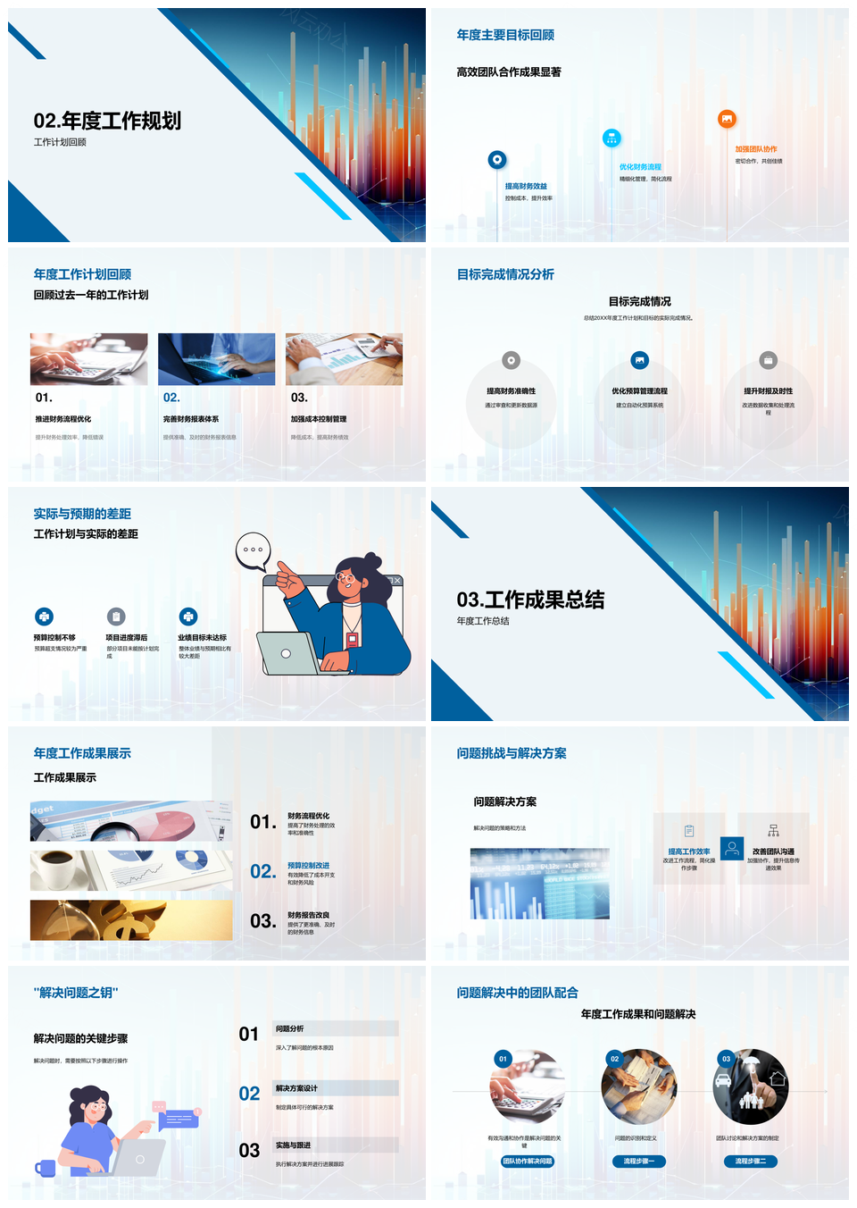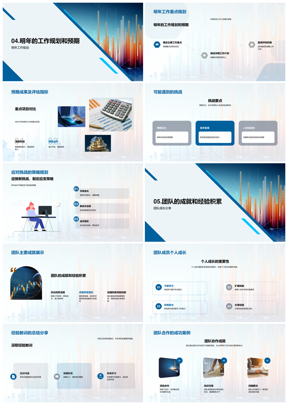 这是一张财务部年度规划执行成果团队成长图表总结PPT模板,包含财务部、年度规划、执行成果、团队成长、图表总结等主题内容,也可用作财务部年度规划执行成果团队成长图表总结、财务部年度规划执行成果团队成长、年度规划执行成果团队成长图表、财务部年度规划执行成果、财务部年度规划团队成长、财务部执行成果团队成长、年度规划执行成果图表总结、执行成果团队成长图表、财务部团队成长图表总结、年度规划执行成果团队、财务部年度规划图表、团队成长图表总结、执行成果团队成长、财务部年度规划、团队成长图表、年度规划执行等PPT场景使用。 风云办公提供的财务部年度规划执行成果团队成长图表总结PPT模板,下载格式为pptx,一共33页,作品中文字及图均可以修改和编辑,图片更改请在作品中右键图片并更换,文字修改请直接点击文字进行修改。