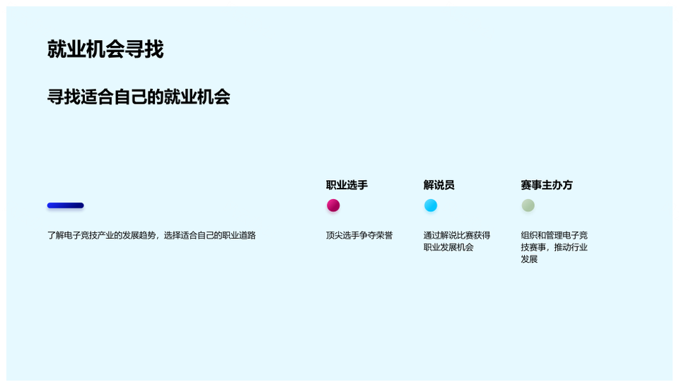 这是一张电子竞技发展全球影响力吸引年轻人就业新趋势PPT模板,包含电子竞技、发展、全球、影响力、吸引、年轻人、就业、新趋势等主题内容,也可用作电子竞技发展全球影响力、发展全球影响力吸引、全球影响力吸引年轻人、吸引年轻人就业新趋势、电子竞技发展全球、发展全球影响力、全球影响力吸引、吸引力年轻人就业、年轻人就业新趋势、电子竞技发展、全球影响力、影响力吸引、吸引年轻人、年轻人就业、就业新趋势等PPT场景使用。 风云办公提供的电子竞技发展全球影响力吸引年轻人就业新趋势PPT模板,下载格式为pptx,一共29页,作品中文字及图均可以修改和编辑,图片更改请在作品中右键图片并更换,文字修改请直接点击文字进行修改。