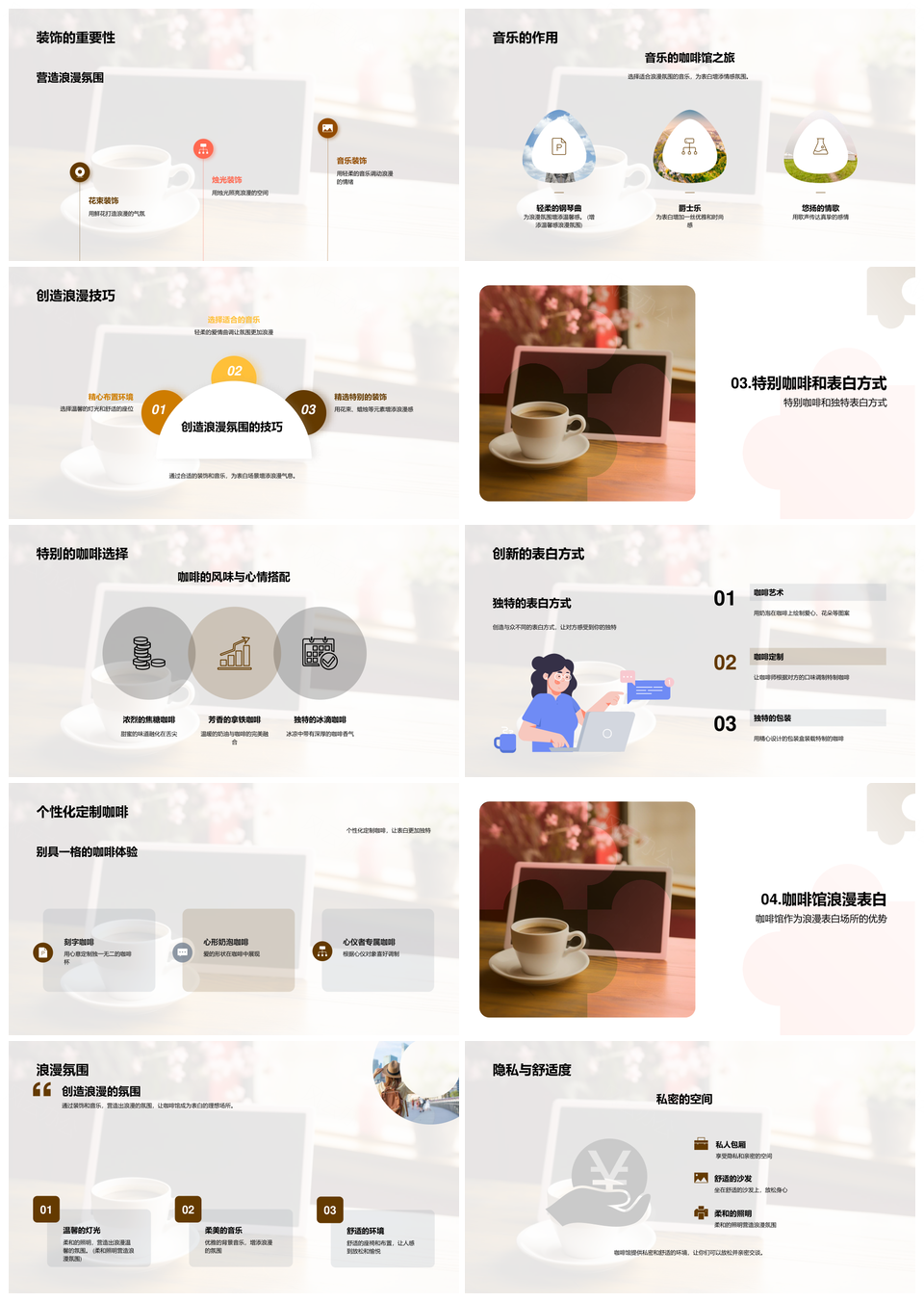 这是一张咖啡馆咖啡杯婚庆相册装饰浪漫爱情告白PPT模板,包含咖啡馆、咖啡杯、婚庆、相册、装饰、浪漫、爱情、告白等主题内容,也可用作咖啡馆婚庆相册装饰、咖啡杯婚庆爱情告白、咖啡馆浪漫爱情告白、婚庆相册浪漫装饰、咖啡杯婚庆相册、婚庆装饰浪漫爱情、相册装饰爱情告白、咖啡馆咖啡杯婚庆、咖啡馆婚庆爱情告白、咖啡杯婚庆相册装饰、相册浪漫爱情告白、咖啡馆婚庆相册、婚庆浪漫爱情告白、咖啡杯婚庆装饰、咖啡馆爱情告白等PPT场景使用。 风云办公提供的咖啡馆咖啡杯婚庆相册装饰浪漫爱情告白PPT模板,下载格式为pptx,一共23页,作品中文字及图均可以修改和编辑,图片更改请在作品中右键图片并更换,文字修改请直接点击文字进行修改。