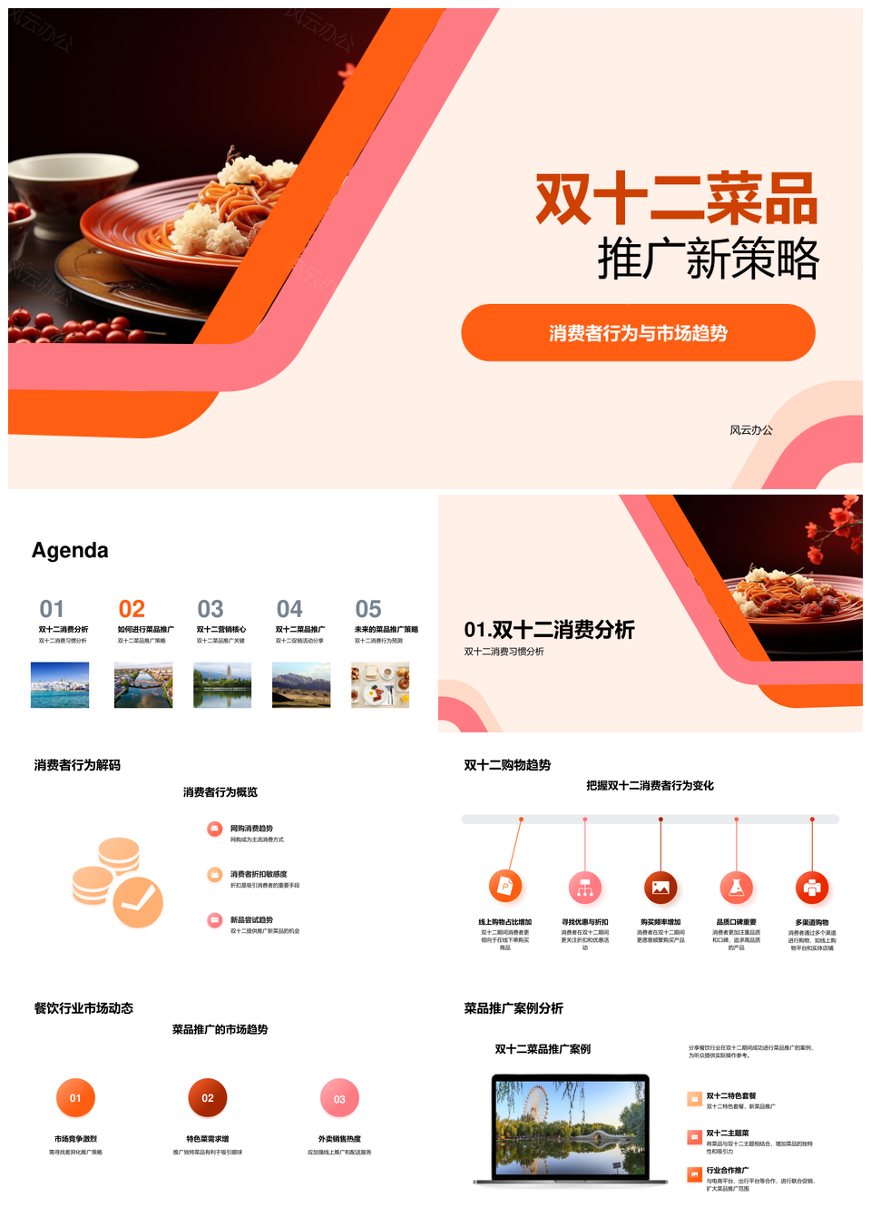 风云办公提供的双十二餐饮业中式菜品推广营销策略PPT模板,下载格式为pptx,一共28页,作品中文字及图均可以修改和编辑,图片更改请在作品中右键图片并更换,文字修改请直接点击文字进行修改。
