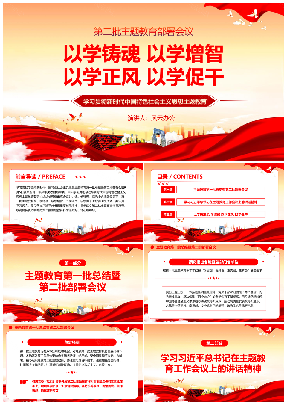 这是一张第二批主题教育部署会议党建四学四下基层五注重PPT模板,包含第二批、主题教育、部署会议、党建、四学、四下基层、五注重等主题内容,也可用作第二批主题教育部署会议党建、主题教育部署会议党建四学、部署会议党建四学四下、党建四学四下基层、四学四下基层五注重、第二批主题教育部署会议、主题教育部署会议党建、部署会议党建四学、党建四学四下、四学四下基层、四下基层五注重、第二批主题教育、主题教育部署会议、部署会议党建、党建四学等PPT场景使用。 风云办公提供的第二批主题教育部署会议党建四学四下基层五注重PPT模板,下载格式为pptx,一共35页,作品中文字及图均可以修改和编辑,图片更改请在作品中右键图片并更换,文字修改请直接点击文字进行修改。