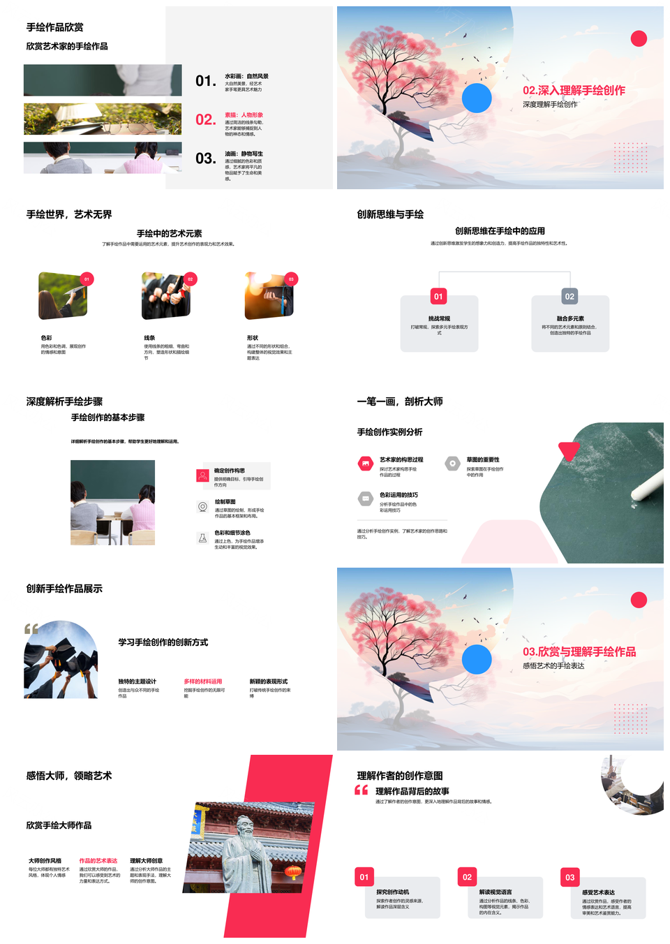 这是一张手绘艺术基础技巧与创作步骤创新思维个人表达PPT模板,包含手绘艺术、基础技巧、创作步骤、创新思维、个人表达等主题内容,也可用作手绘艺术基础技巧、艺术基础技巧创作、基础技巧创作步骤、技巧创作步骤创新、创作步骤创新思维、步骤创新思维个人、创新思维个人表达、手绘艺术基础、艺术基础技巧、基础技巧创作、技巧创作步骤、创作步骤创新、步骤创新思维、创新思维个人、思维个人表达等PPT场景使用。 风云办公提供的手绘艺术基础技巧与创作步骤创新思维个人表达PPT模板,下载格式为pptx,一共33页,作品中文字及图均可以修改和编辑,图片更改请在作品中右键图片并更换,文字修改请直接点击文字进行修改。