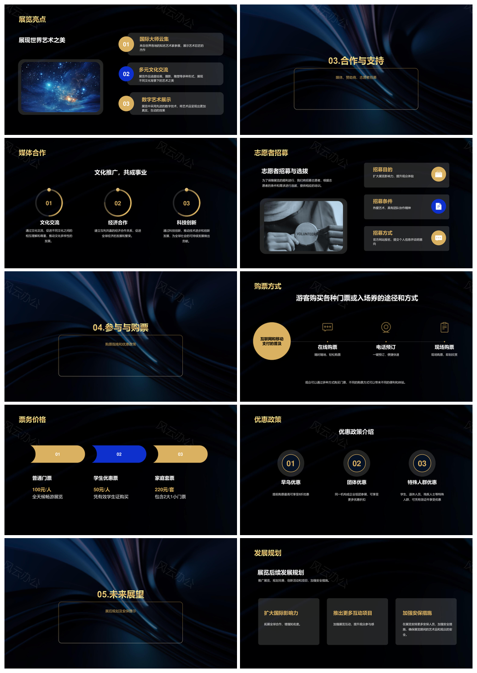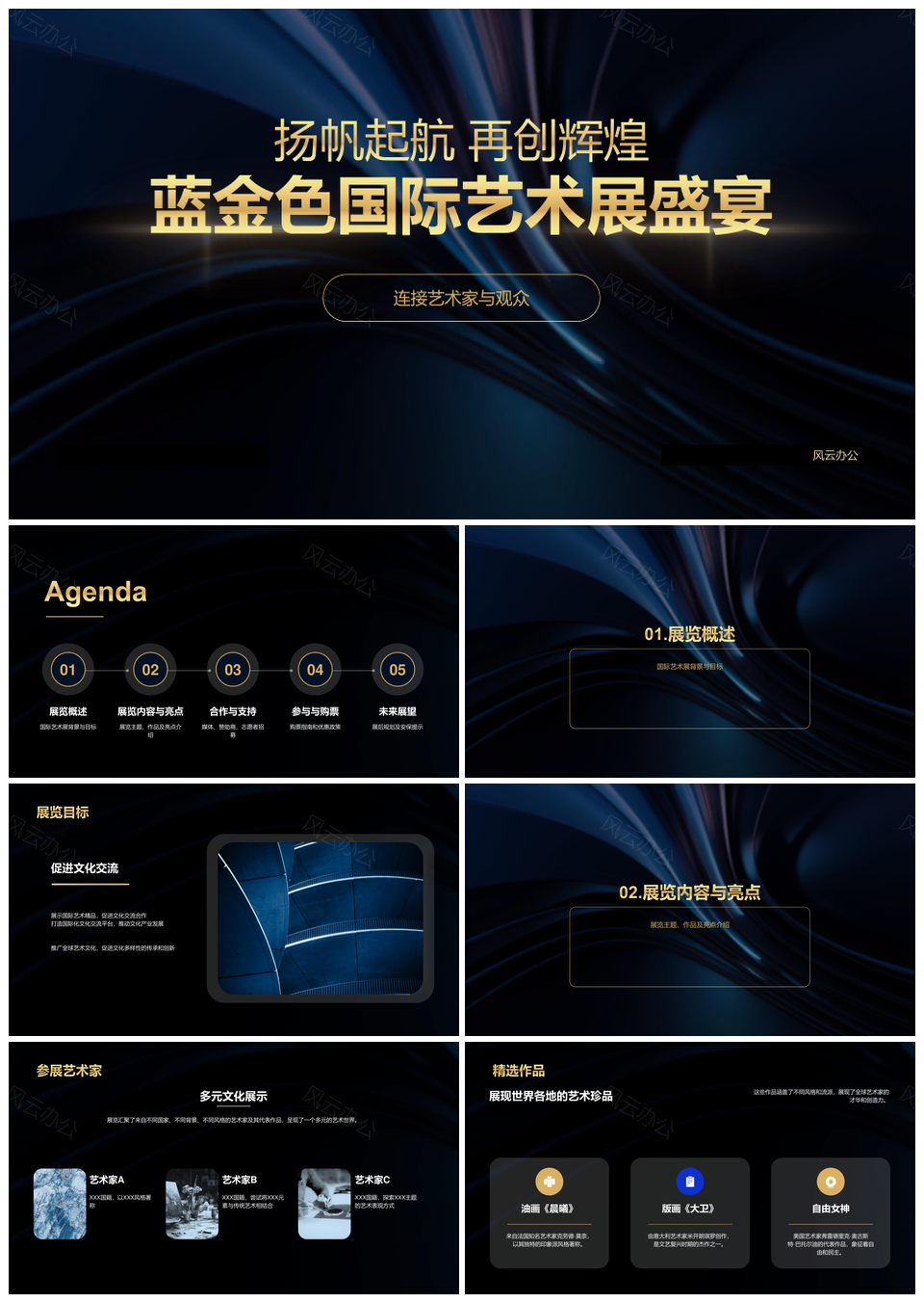 风云办公提供的蓝金色简约高级国际艺术展盛宴PPT模板,下载格式为pptx,一共20页,作品中文字及图均可以修改和编辑,图片更改请在作品中右键图片并更换,文字修改请直接点击文字进行修改。