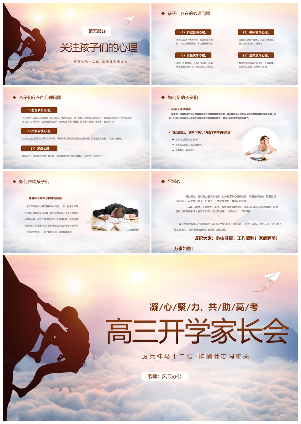 风云办公提供的高三凝心聚力共助高考线上家长会PPT模板,下载格式为pptx,一共35页,作品中文字及图均可以修改和编辑,图片更改请在作品中右键图片并更换,文字修改请直接点击文字进行修改。