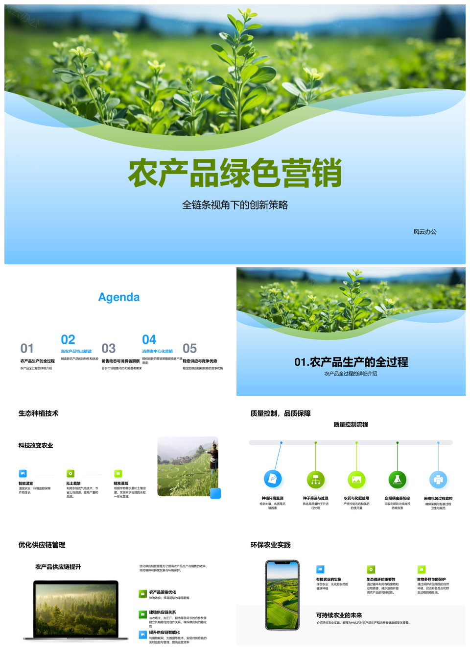 风云办公提供的全链创新绿色农产品营销环保质控PPT模板,下载格式为pptx,一共28页,作品中文字及图均可以修改和编辑,图片更改请在作品中右键图片并更换,文字修改请直接点击文字进行修改。