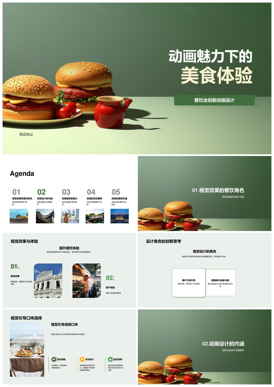 风云办公提供的动画美食创新设计赋能餐饮体验PPT模板,下载格式为pptx,一共23页,作品中文字及图均可以修改和编辑,图片更改请在作品中右键图片并更换,文字修改请直接点击文字进行修改。
